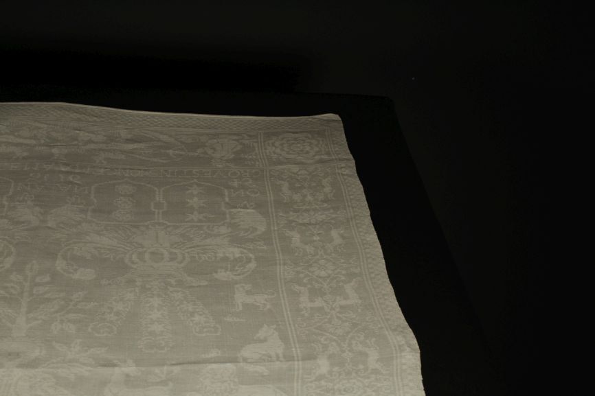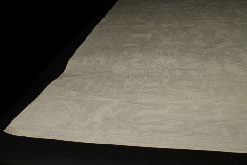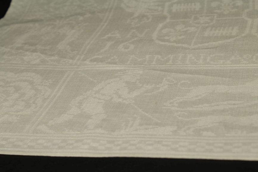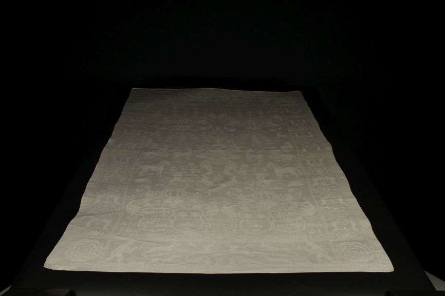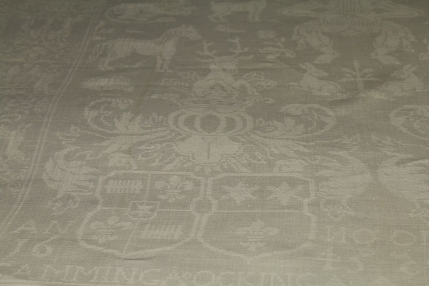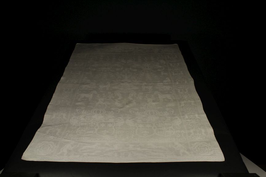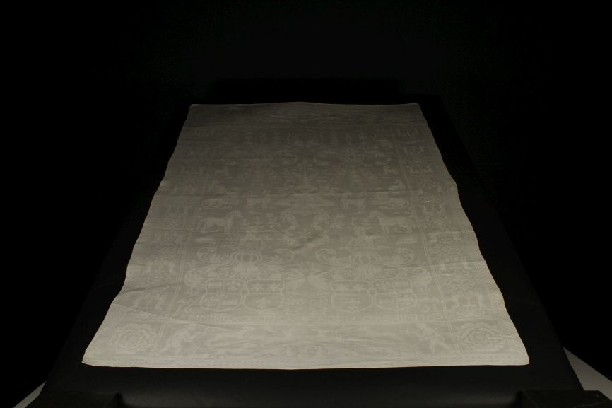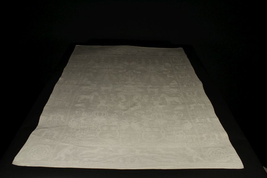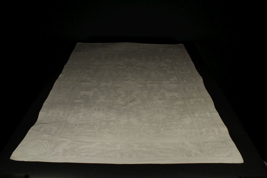Servet van wit linnen damast met spiegelend patroon van Orpheus en de dieren naam Camminga-Ockingaen wapeninweving,