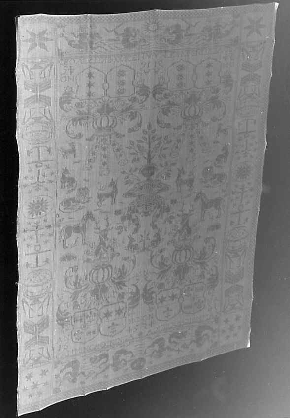 Servet van wit linnen damast met spiegelend patroon van Orpheus en de dieren met Poseidon en drietand in de rand, naam en wapen inweving