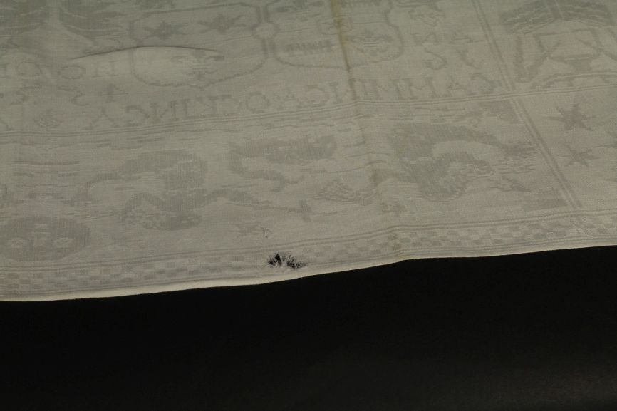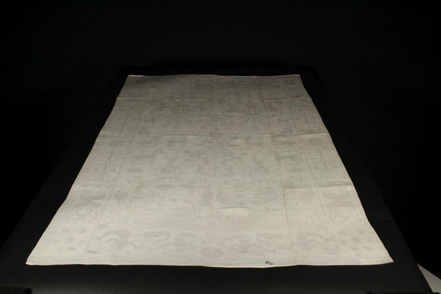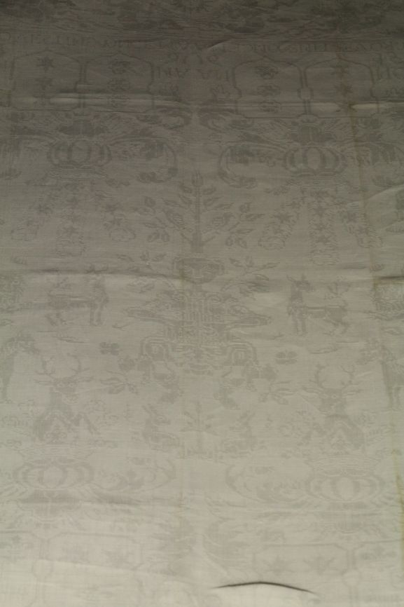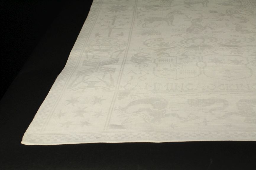 Servet van wit linnen damast met spiegelend patroon van Orpheus en de dieren met Poseidon en drietand in de rand, naam en wapen inweving