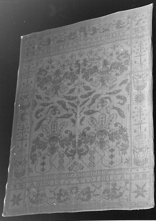 Servet van wit linnen damast, met spiegelend patron van poseidon, zeedieren en zeevaartmotieven, naam- en wapeninweving