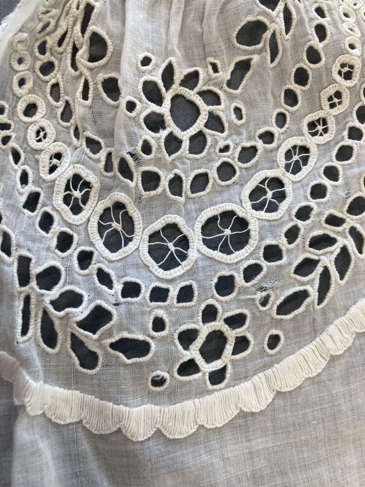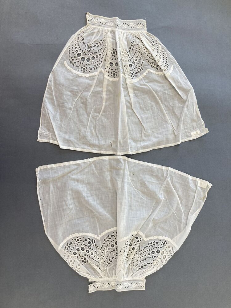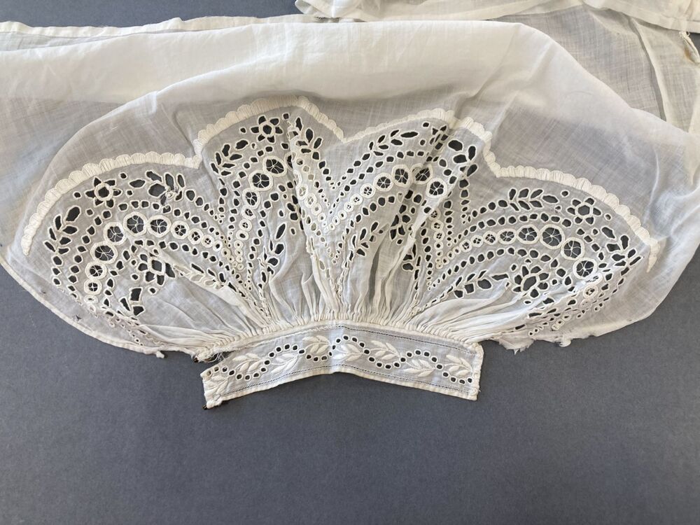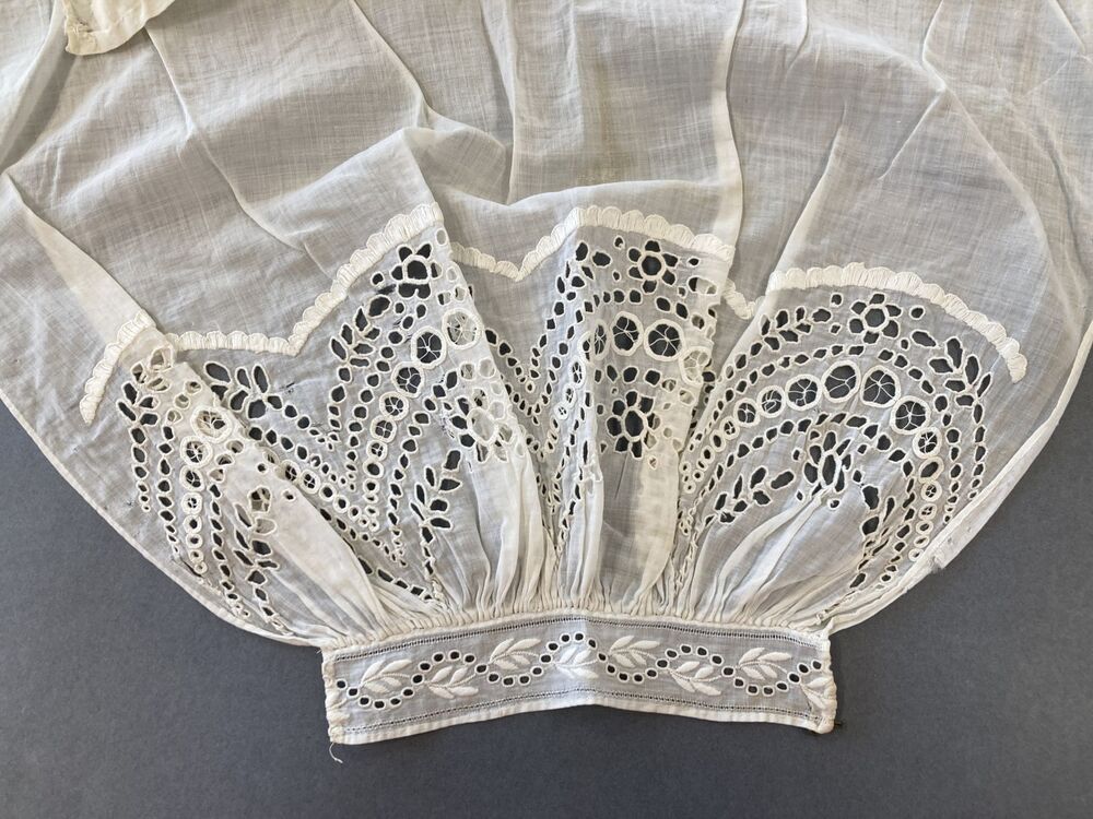 Paar witte ondermouwen van neteldoek of batist met opengewerkt borduurwerk