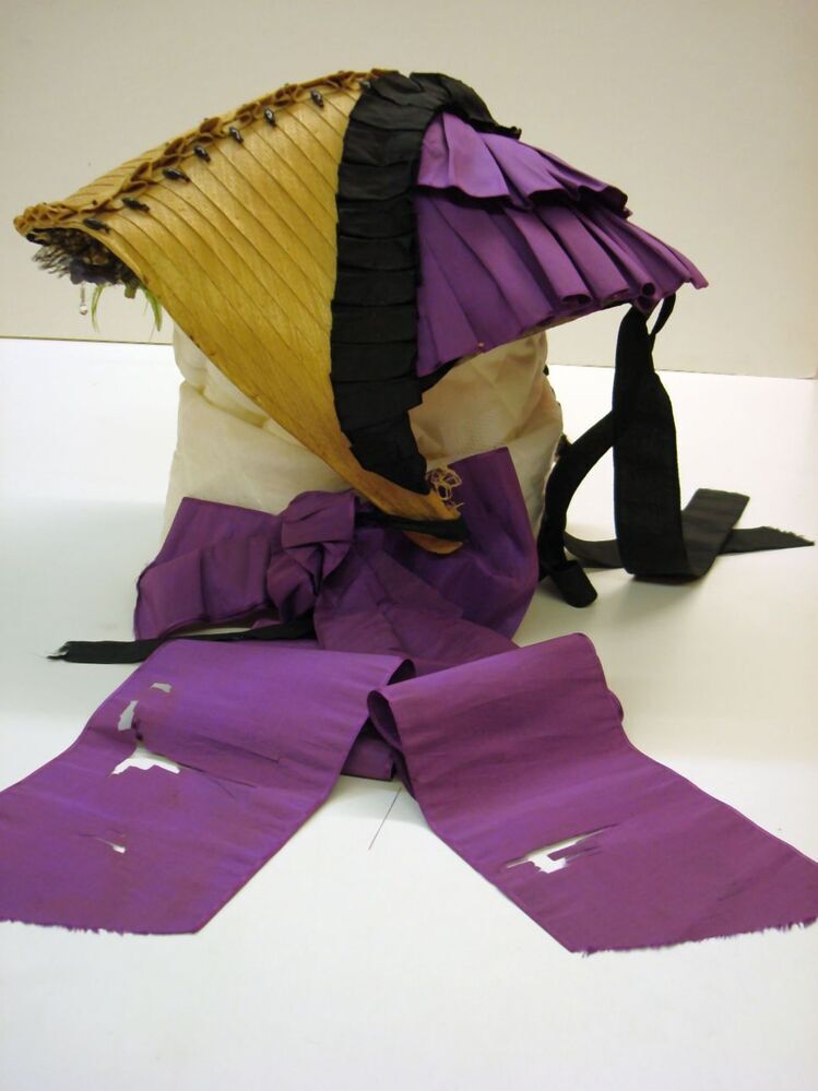 Dameshoedje van fijn stro, overnaads genaaid, versierd met lila en zwart lint, verder bloemcorsage