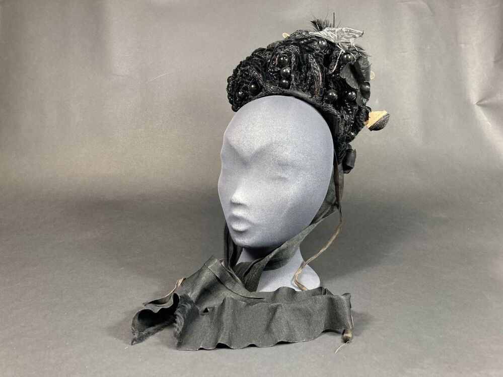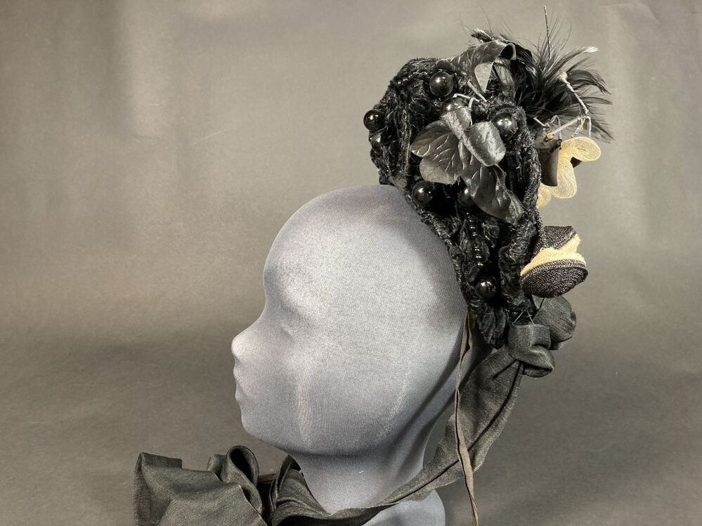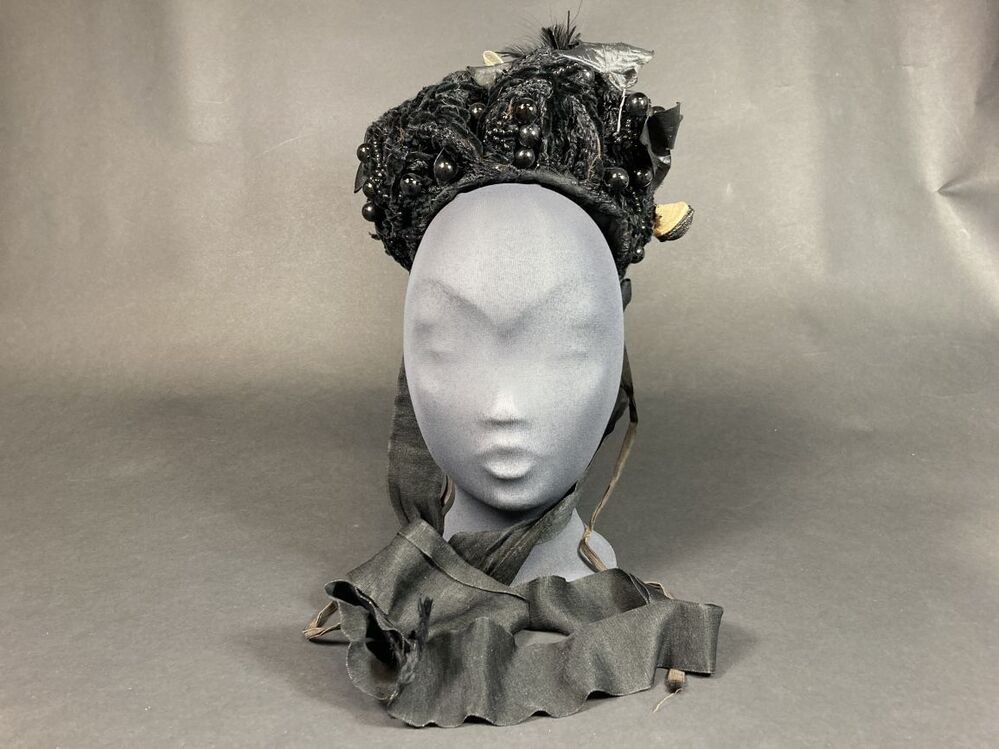 Dameshoedje van zwarte stof, verder opgemaakt met dikke zwarte kralen, struisveer en keelbanden