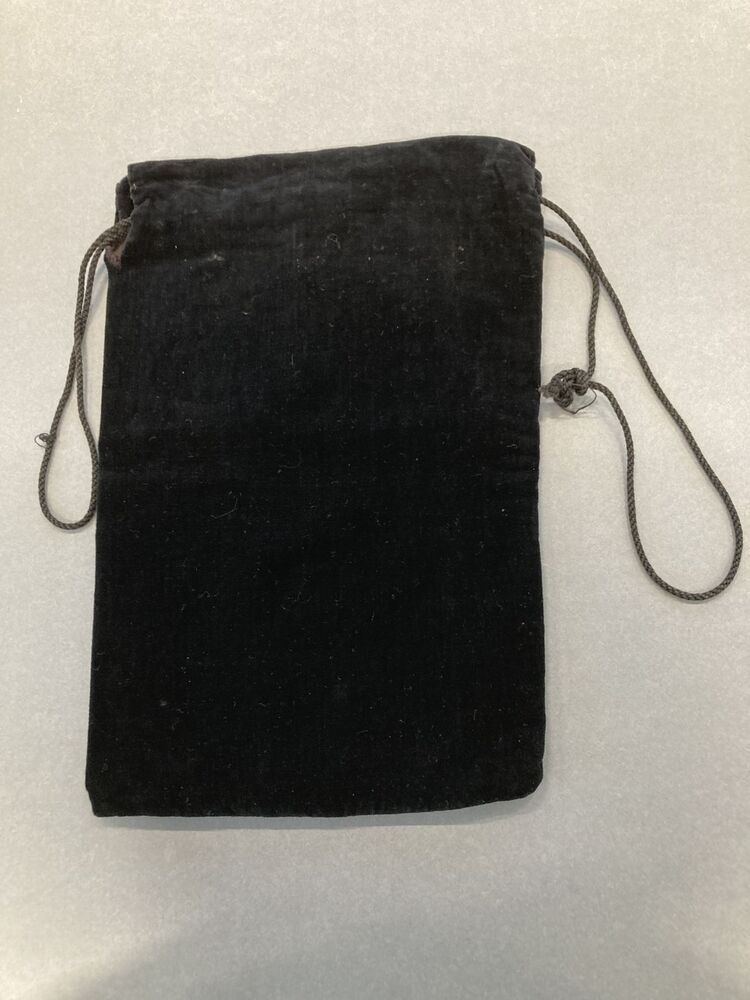 Tasje van zwart fluweel, gevoerd met donkerbruin katoenen satijn, sluit met koordje door sleuf