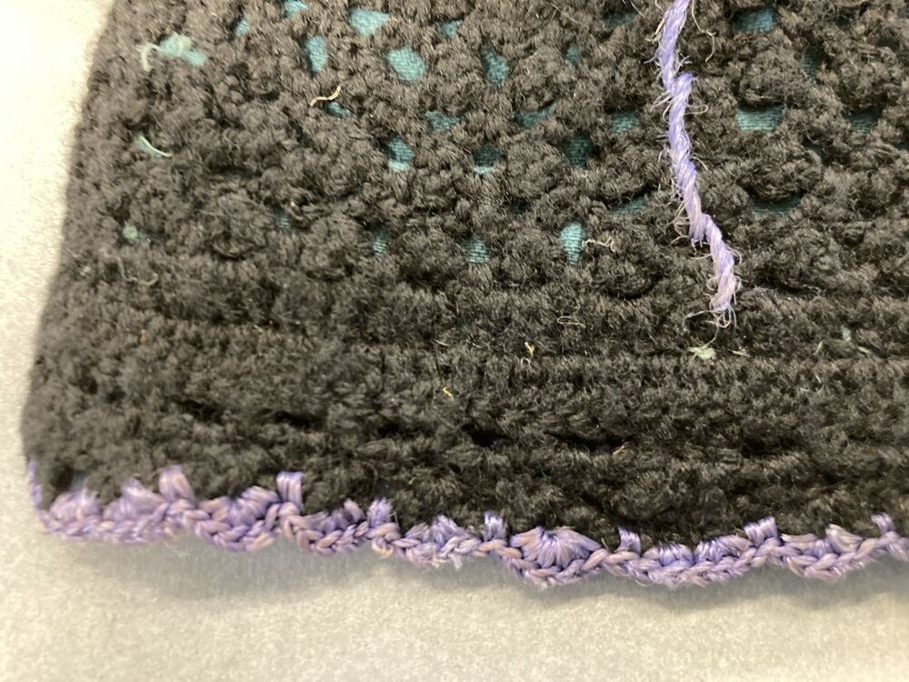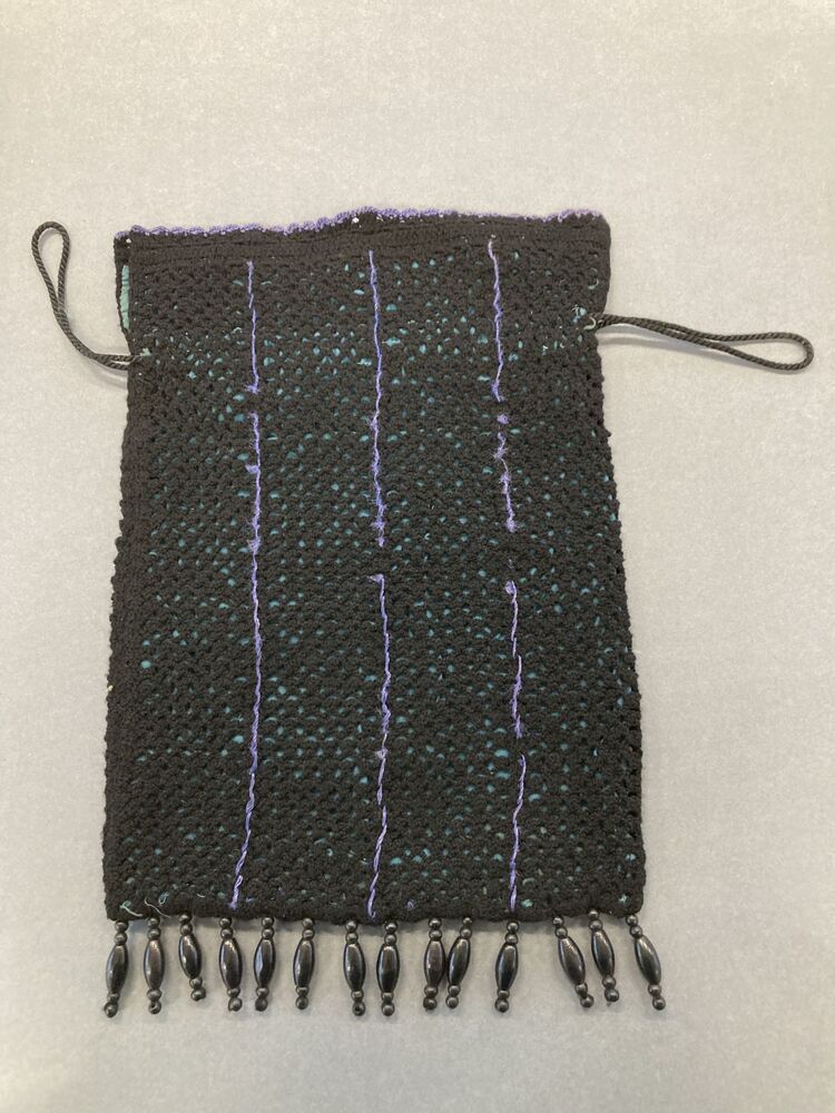 Tasje gehaakt van zwart wol, gevoerd met turquoise katoensatijn