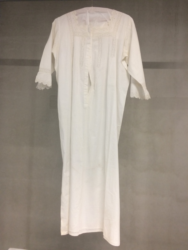 Nachthemd van witte katoen, afgezet met kant en middenvoor een knoopsluiting