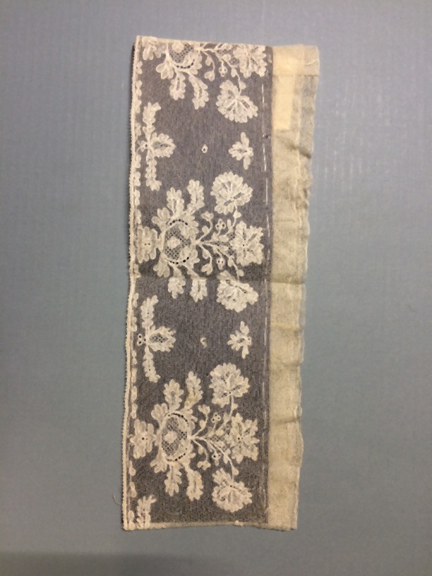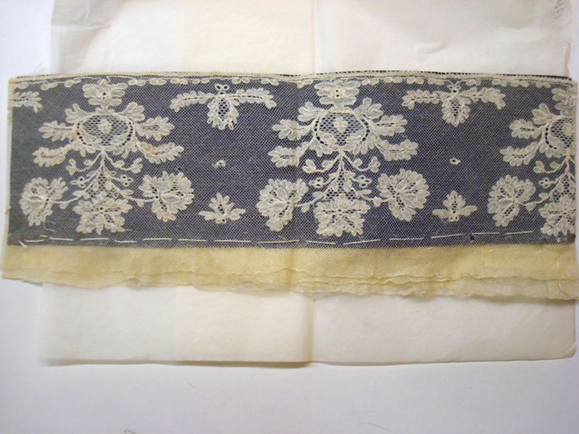 Mutsenstrook van tuledoorstop, vastgeregen op blauw papier
