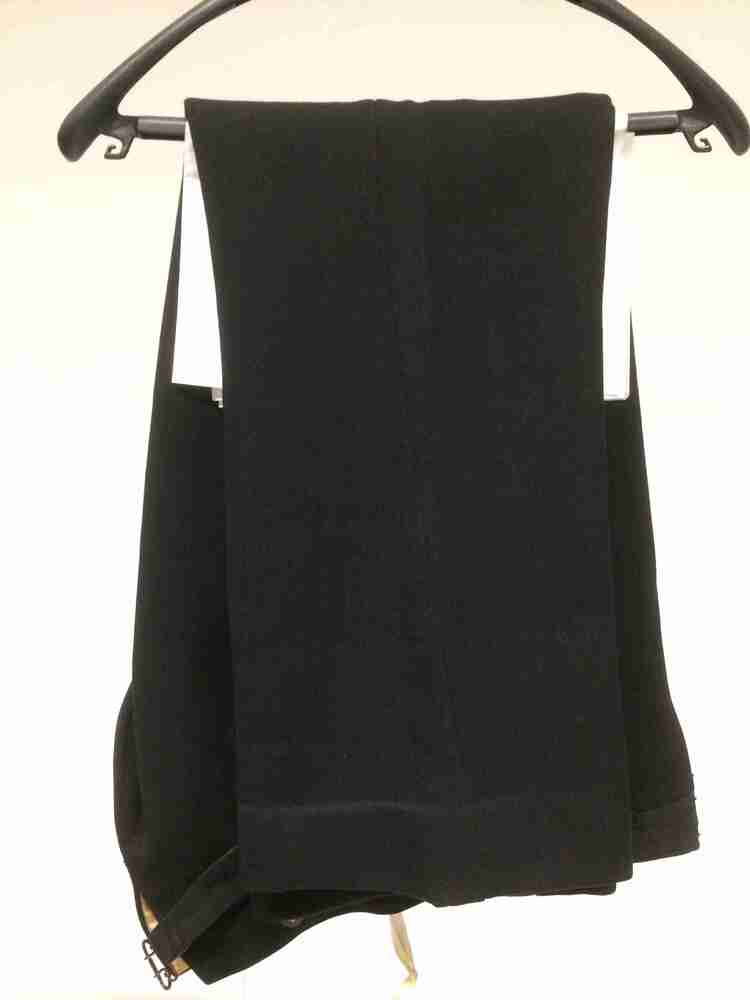 Zwarte lange broek van zwart wollen whipcord met gulpsluiting, onderdeel van mannenkostuum