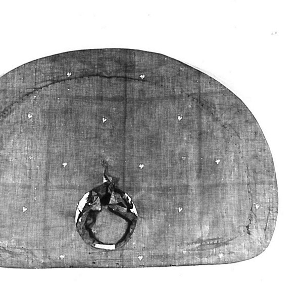 Strooien zonhoed (voor de rouw?) overtrokken met bedrukte katoen