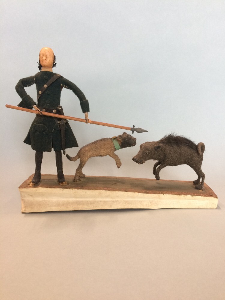 Jager met speer, hond en everzwijn op scharnierende grond met pieper