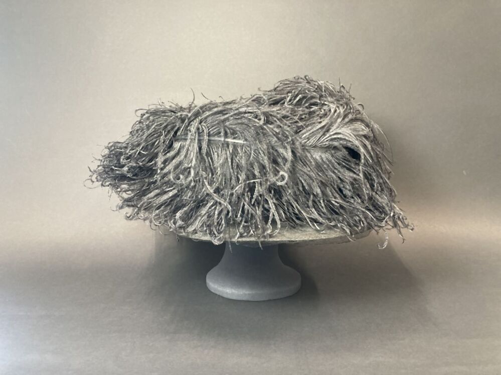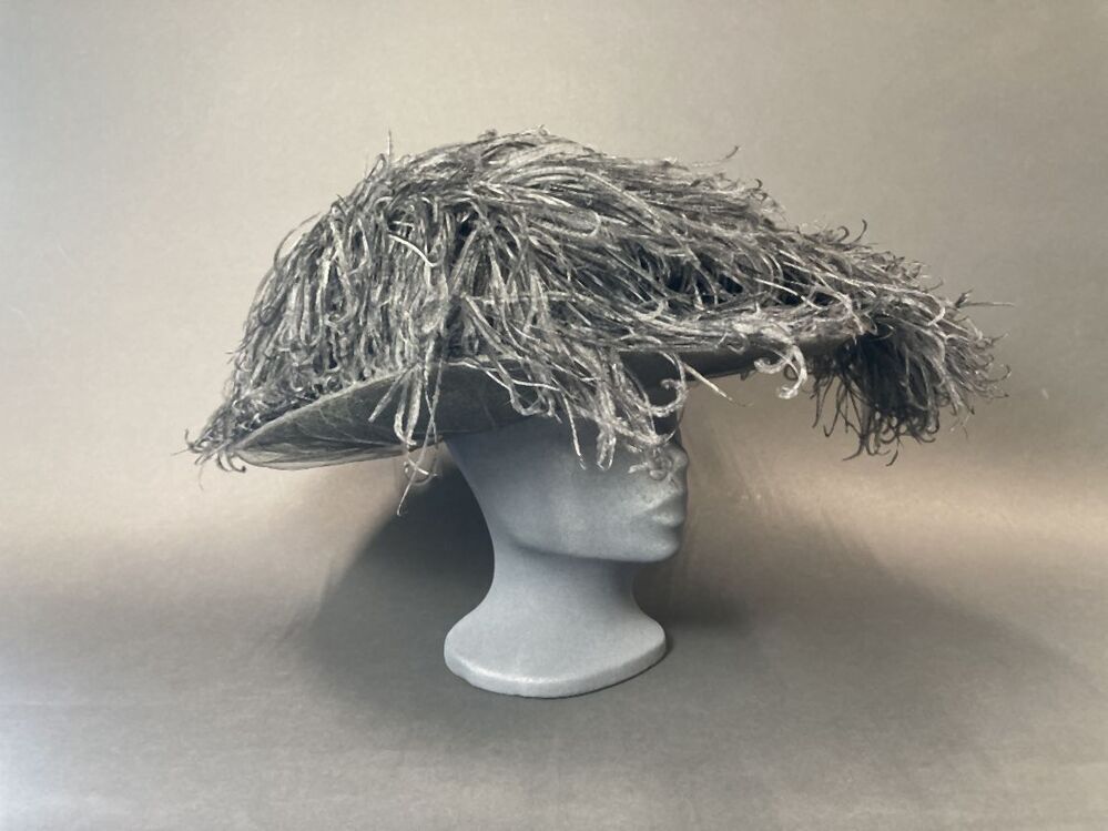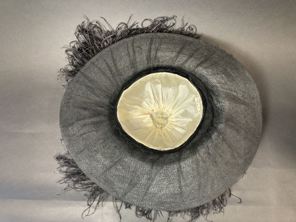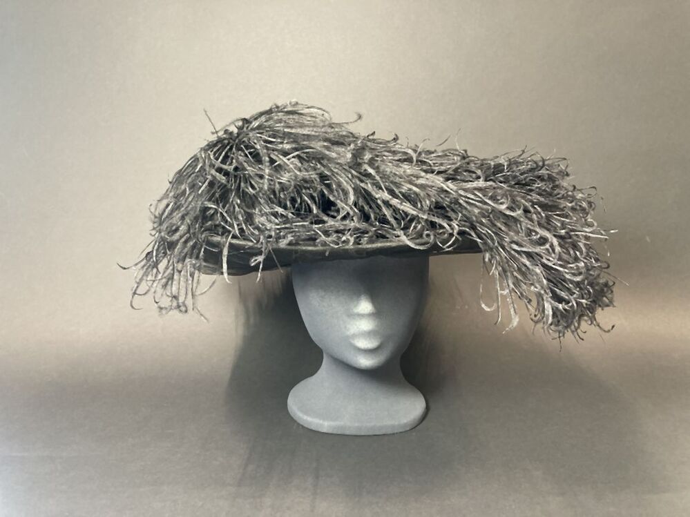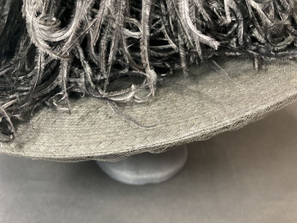 Dameshoed van stro, zwart, overtrokken met zwarte tule en versierd met zwarte struisveren