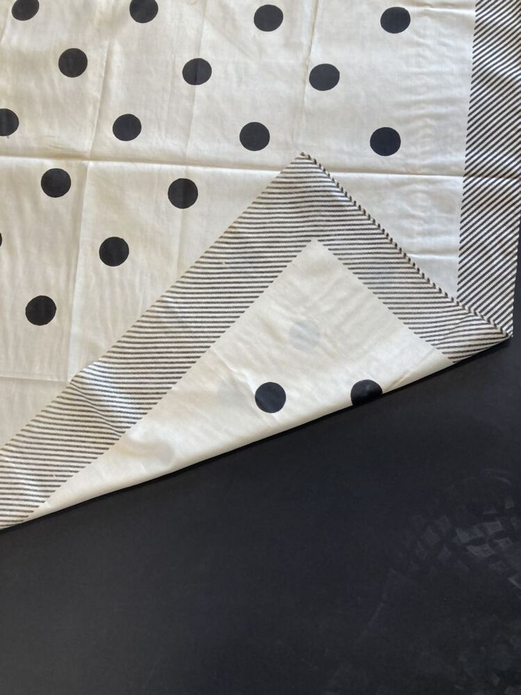 Sjaal van witte zijde bedrukt met zwarte noppen en diagonaal gestreepte rand