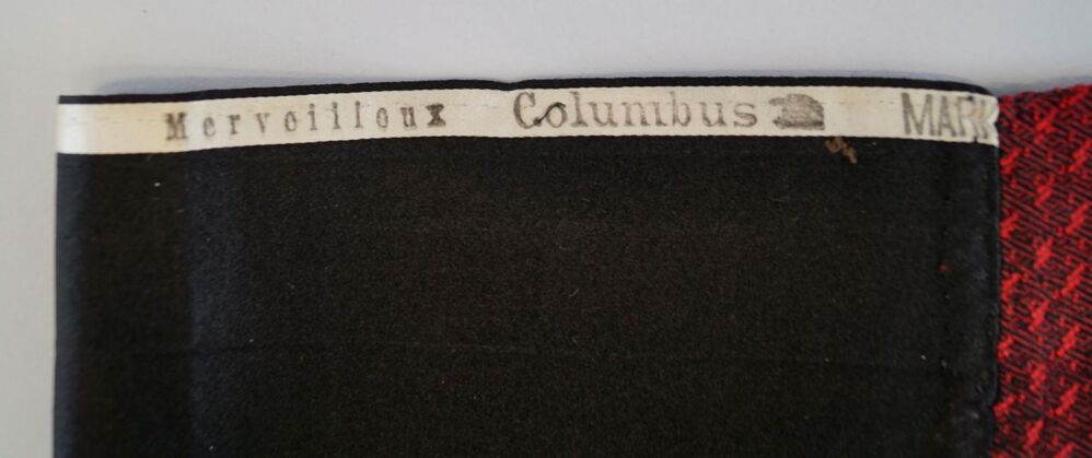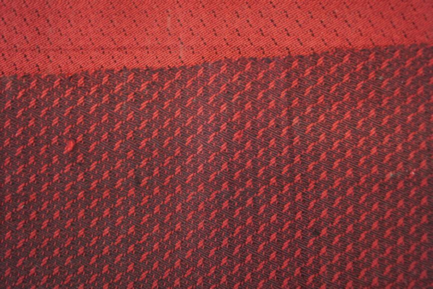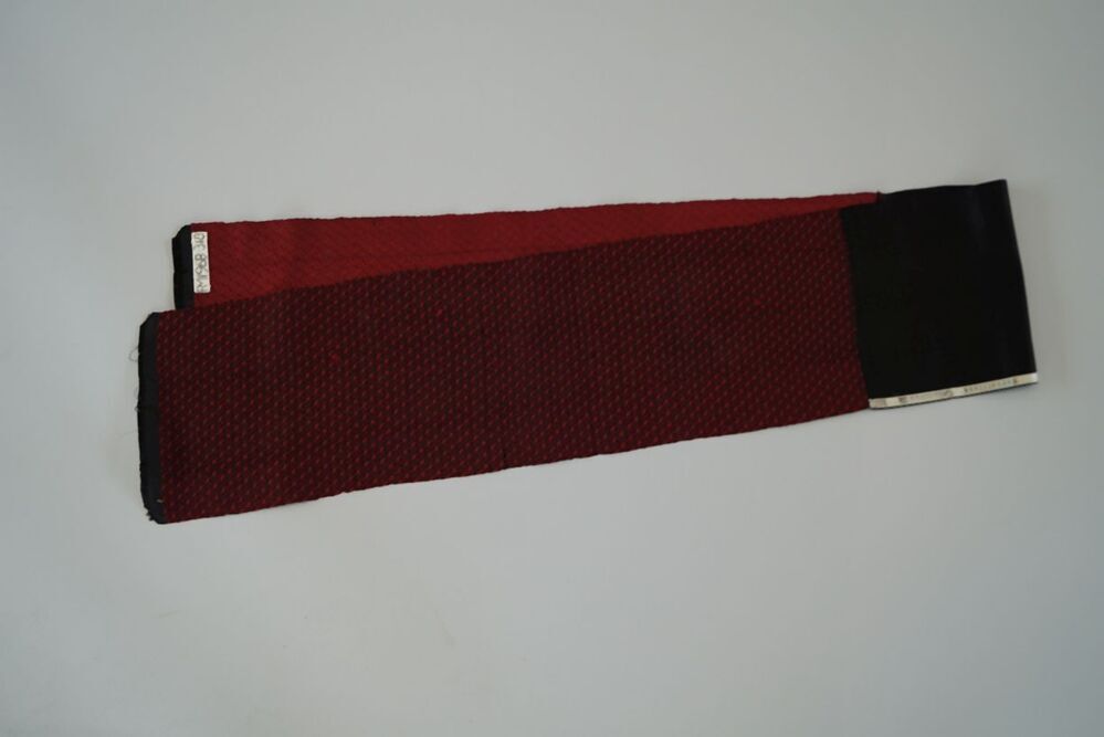 Sjaal van zijde geweven in klein fantasiemotiefje in de kleuren zwart en rood, met ingezet stuk zwart satijn