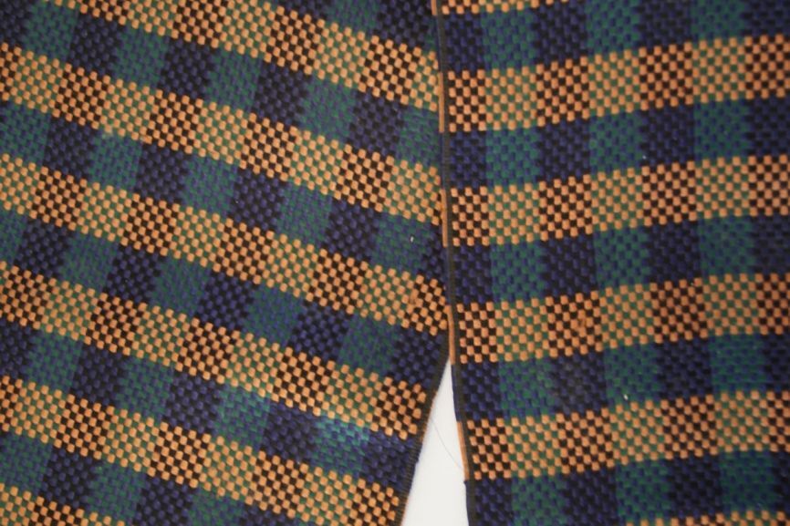 Sjaal van zijde geweven in ruitmotief met dwarsstrepen in de kleuren groen, zwart, cognac en blauw