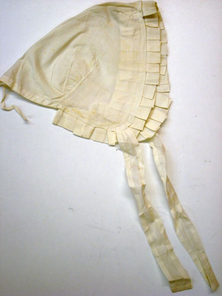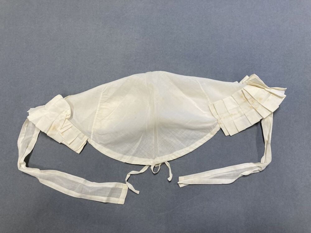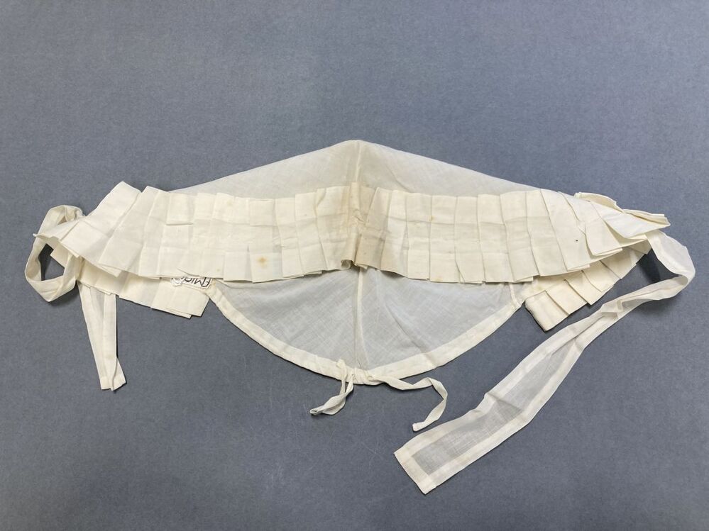 Muts van witte katoen, twee keelbanden, langs het gezicht een geplooide strook