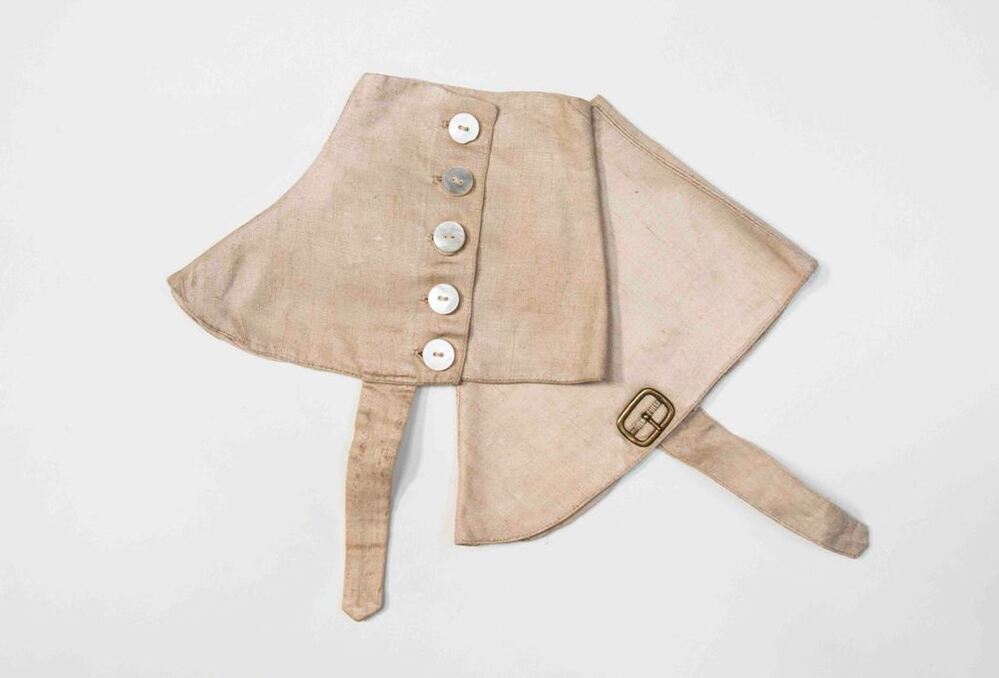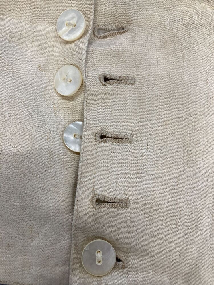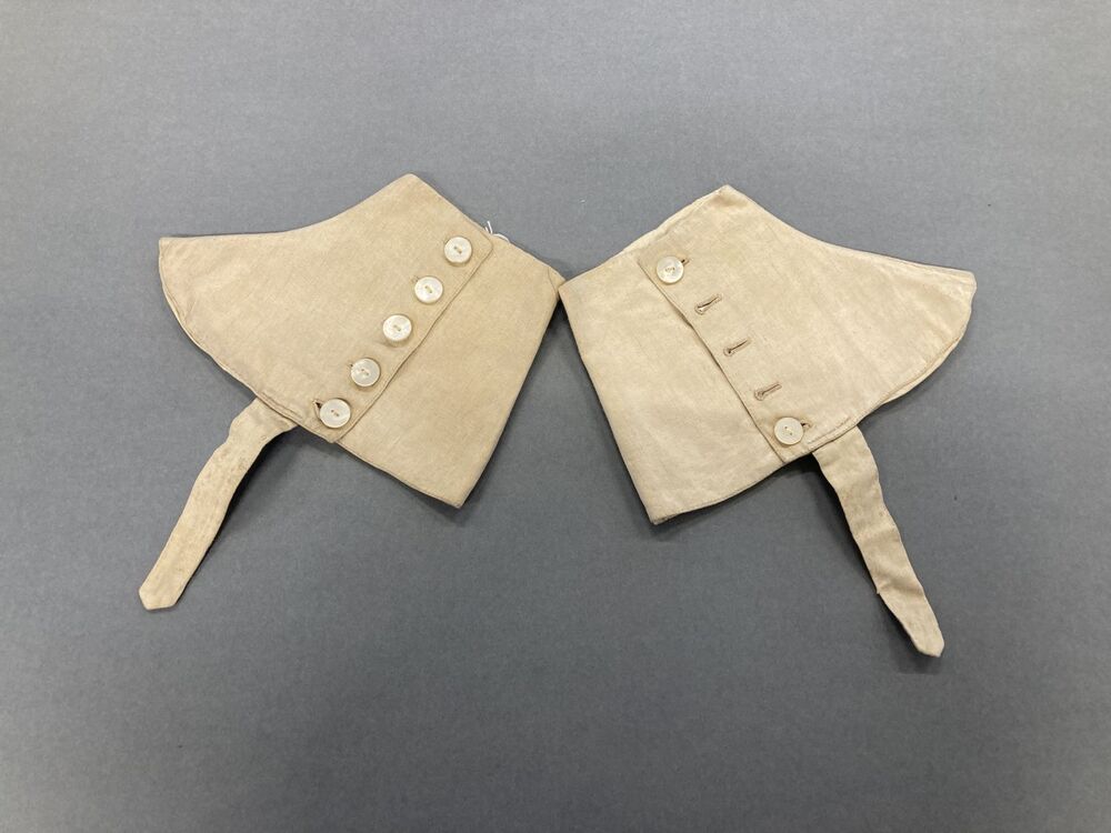 Paar souspieds van beige keperstof, sluit met vijf parelmoeren knopen, onder de voet een bandje met koperen gesp