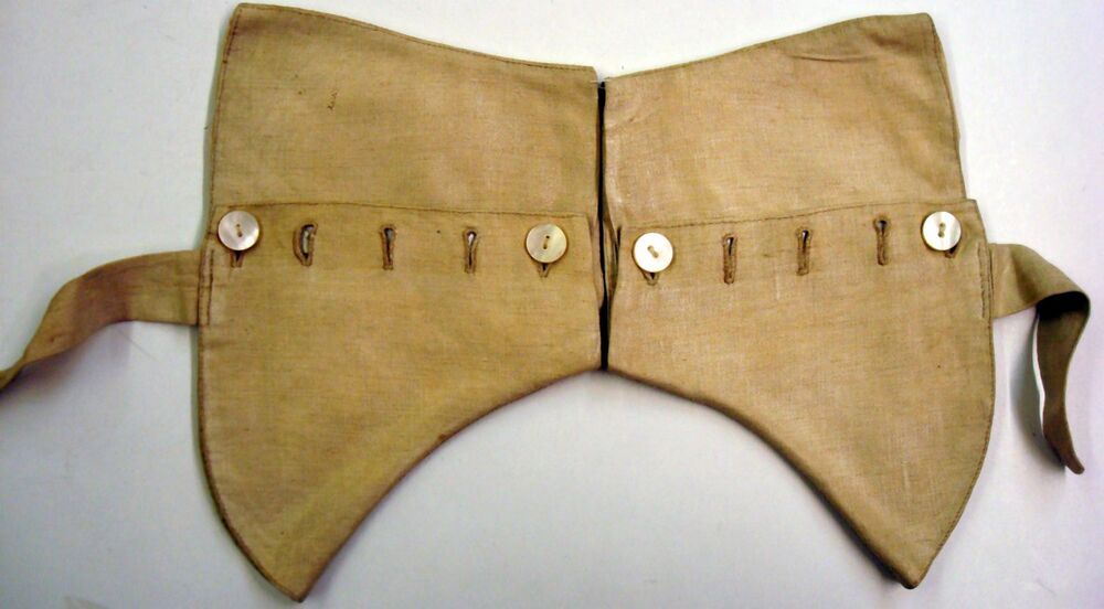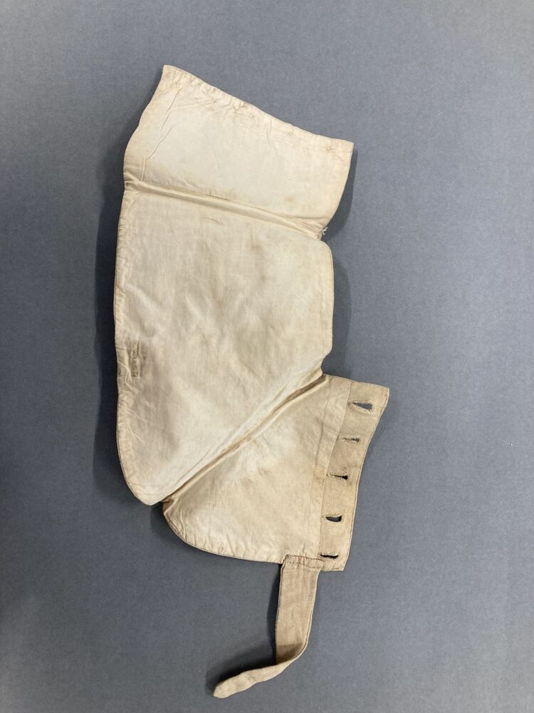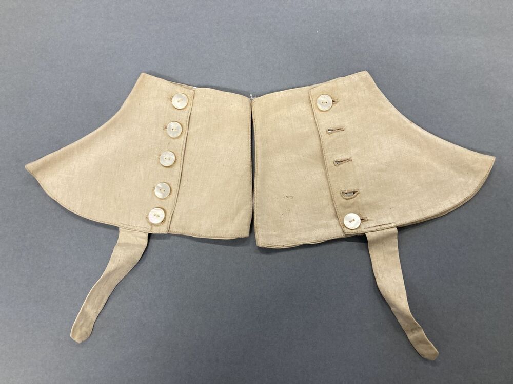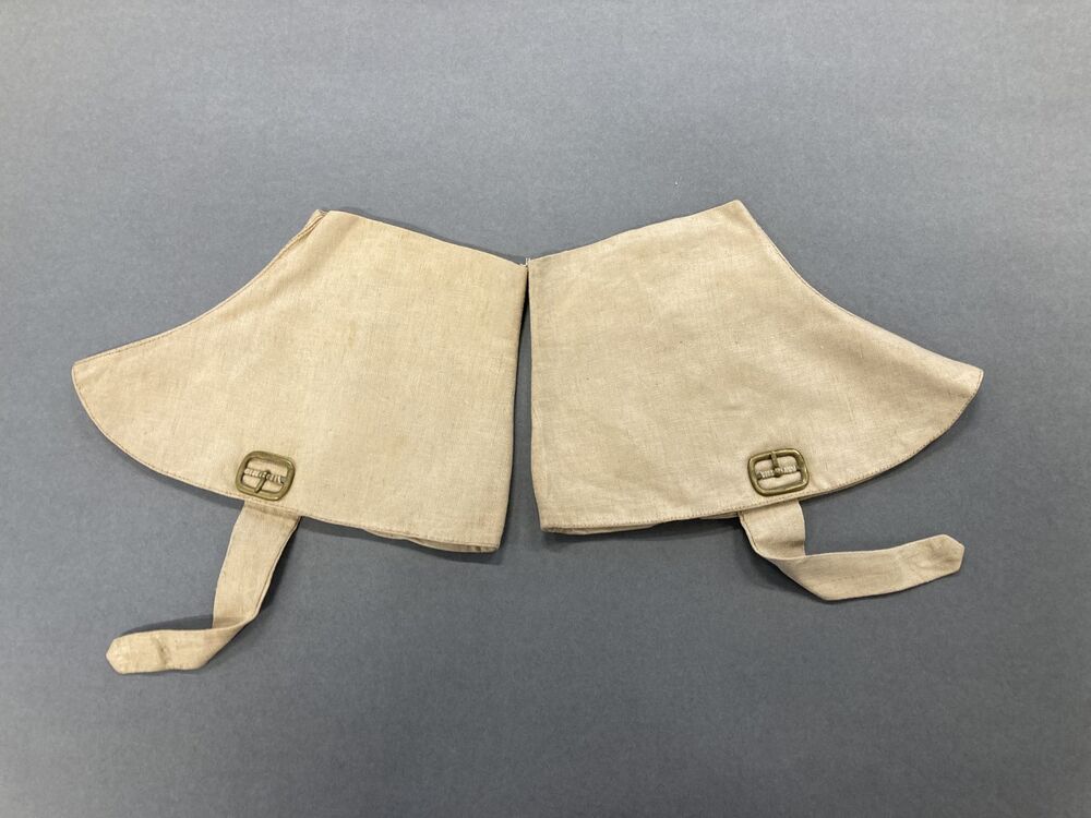Paar souspieds van beige keperstof, sluit met vijf parelmoeren knopen, onder de voet een bandje met koperen gesp