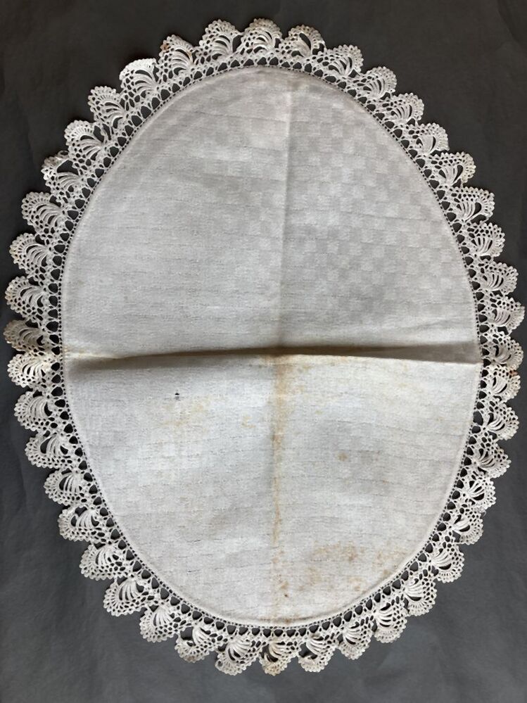 Ovaal kleedje van wit pellendoek, met gehaakte rand