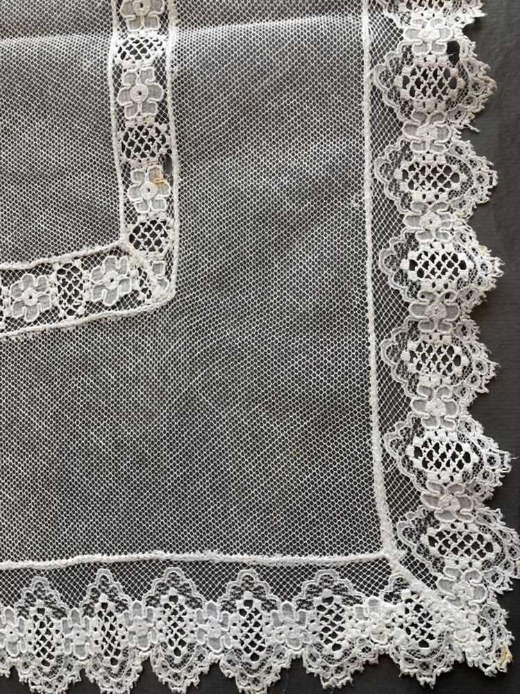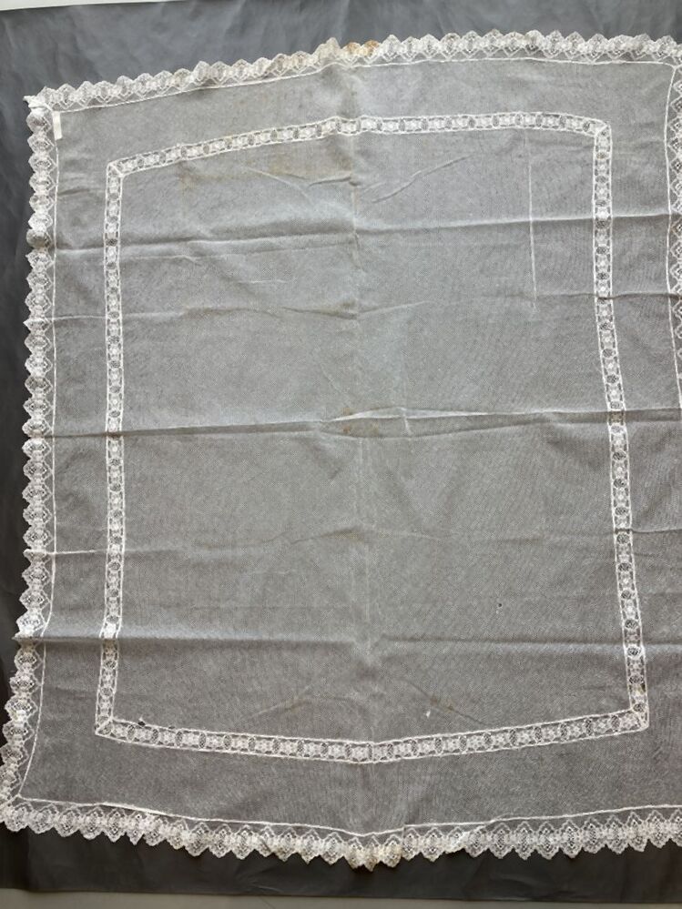 Tafelkleed van witte tule met ingezette rand en rondom rand van machinale kant