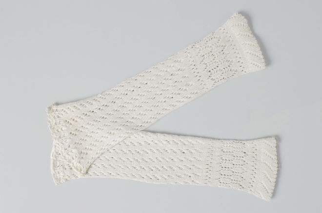 Paar mouwen gebreid van wit katoen in lengte strepen ajour