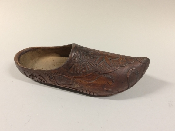Een klomp, van een paar klompen, besneden met volkskunstige motieven