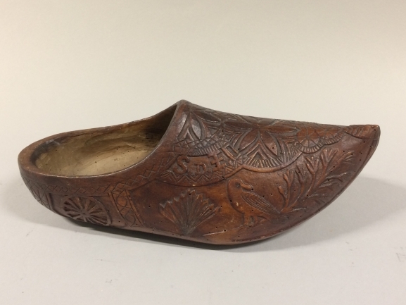 Een klomp, van een paar klompen, besneden met volkskunstige motieven