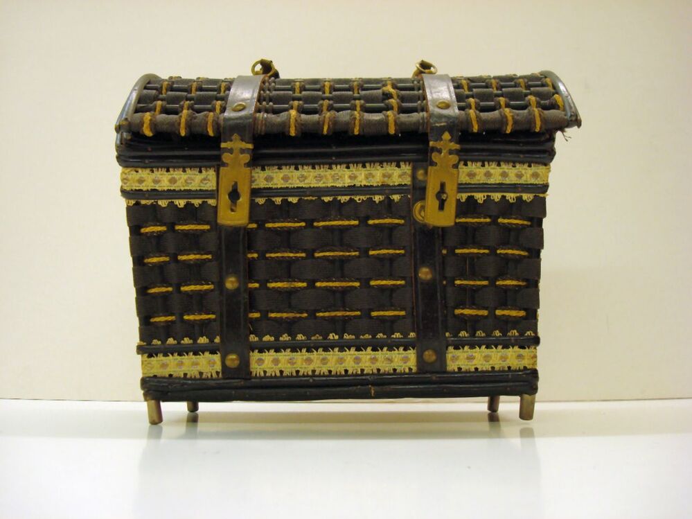 Mandje met deksel, gemaakt van zwart riet met daardoorheen gevlochten zwart band en goudgalon
