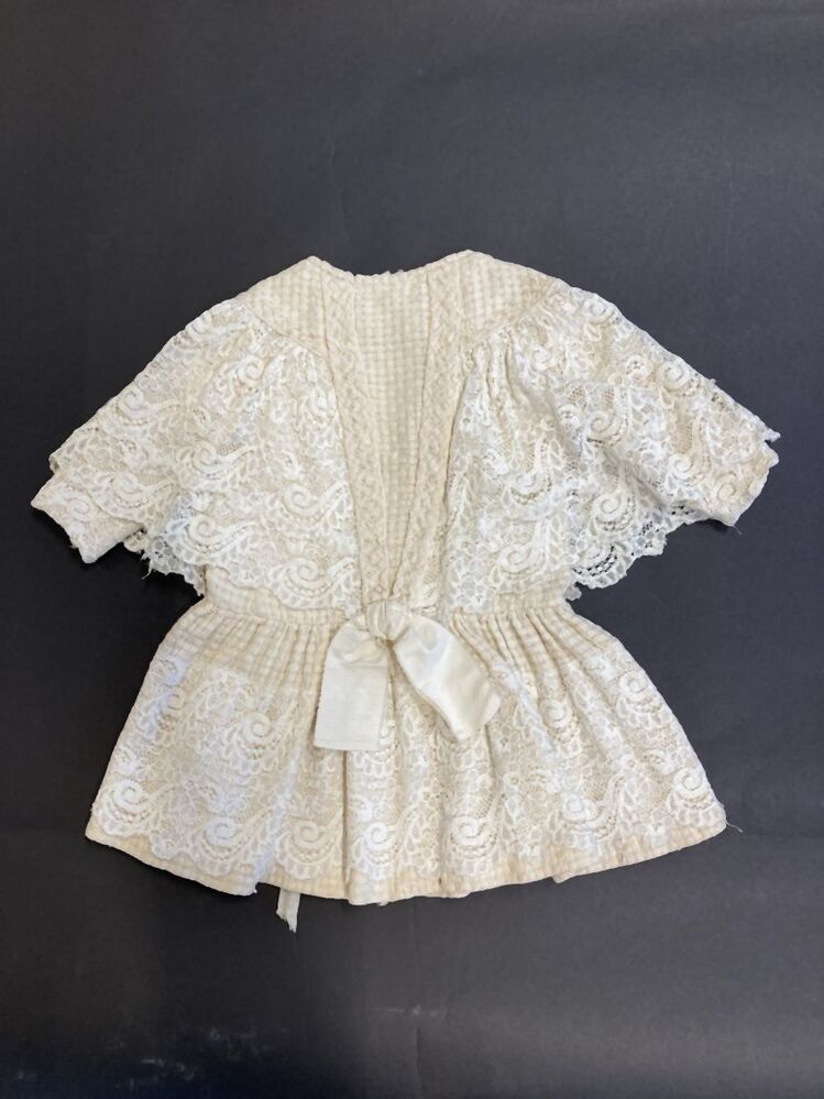 Zomerjas voor meisje van vijf à zes jaar van écru katoenen stof met een blokmotief, versierd met breed kant