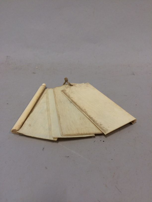 Balboekje van ivoor waarin vijf schrijfblaadjes, op de ene kant een schroefknopje, hieronder een potloodje