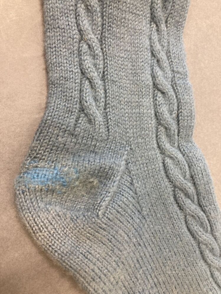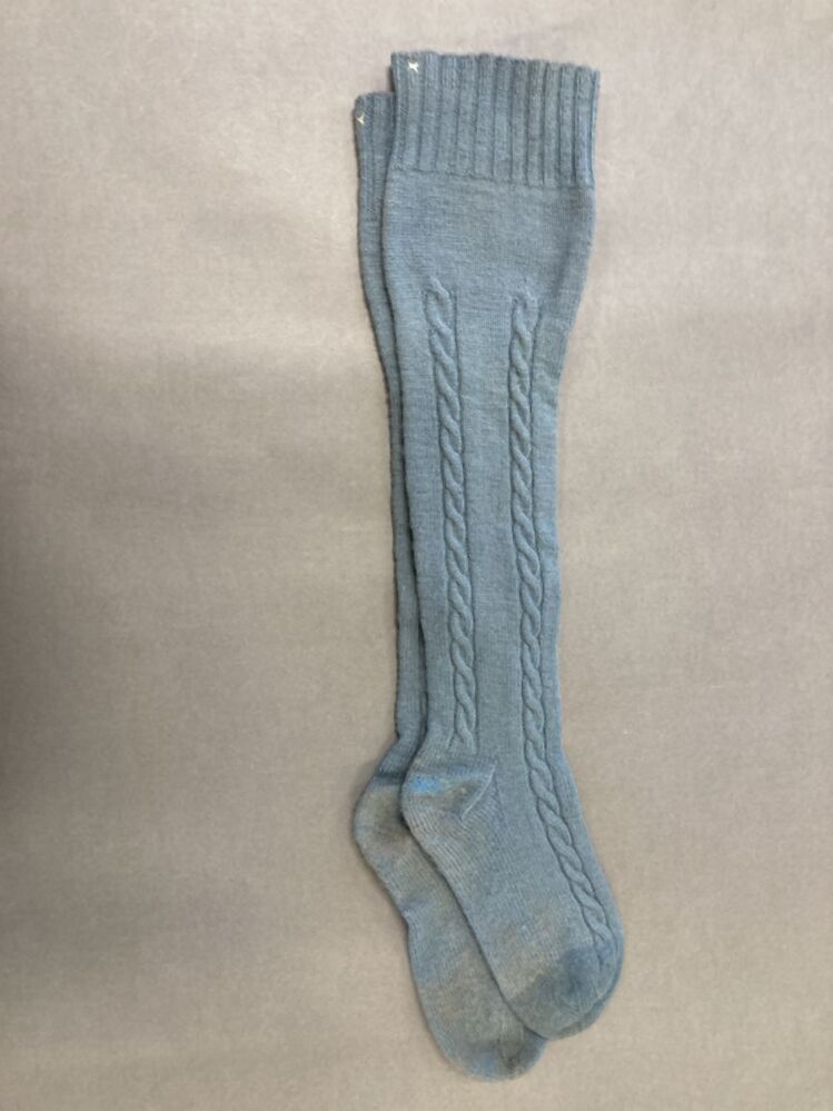 Paar grijsblauwe kousen met kabels van gebreid van wol