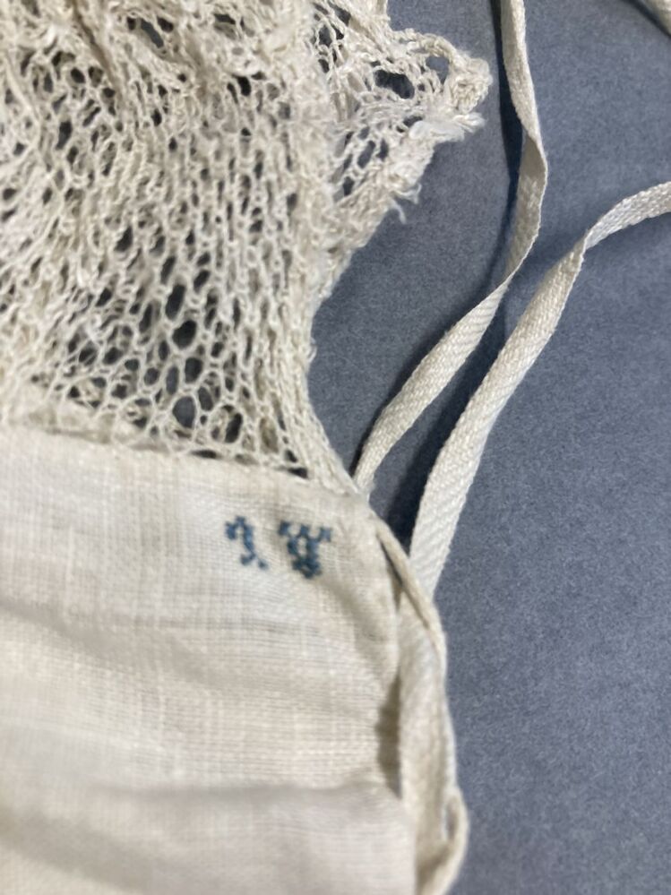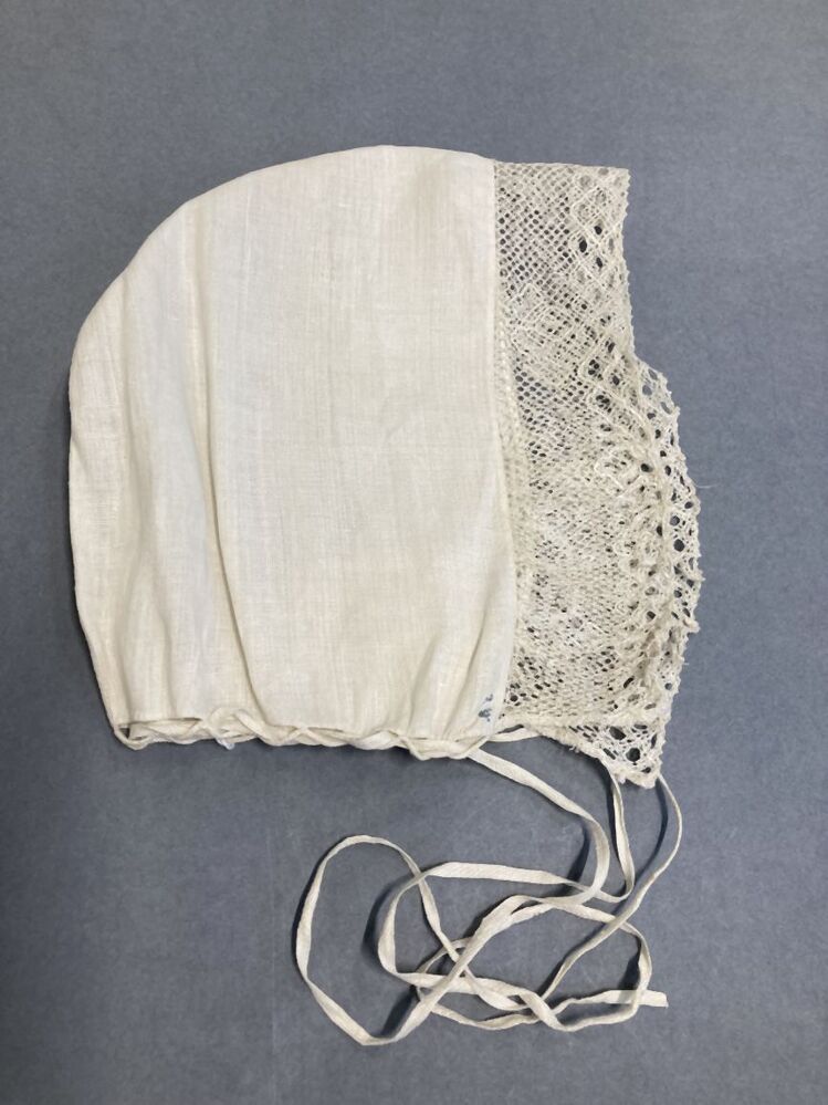 Een linnen muts met een bol, aan de voorzijde een strook torchonkant