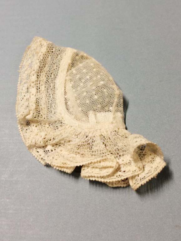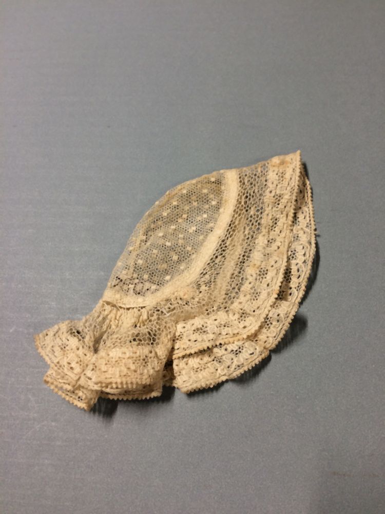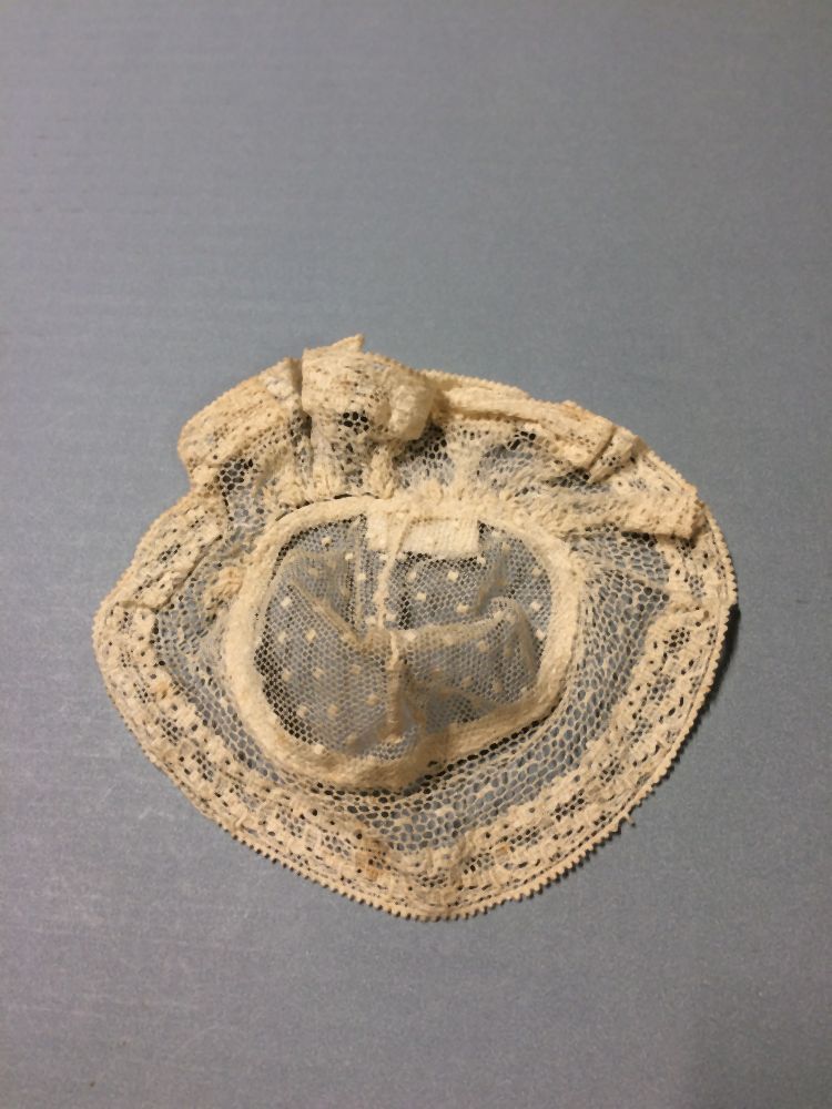 Floddermuts pop met genopte tule en machinaal kant