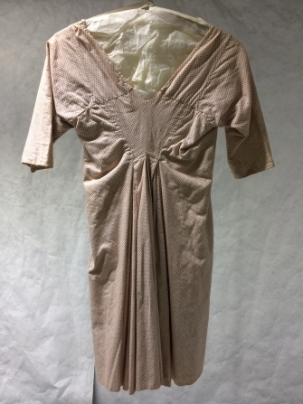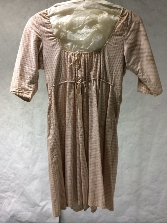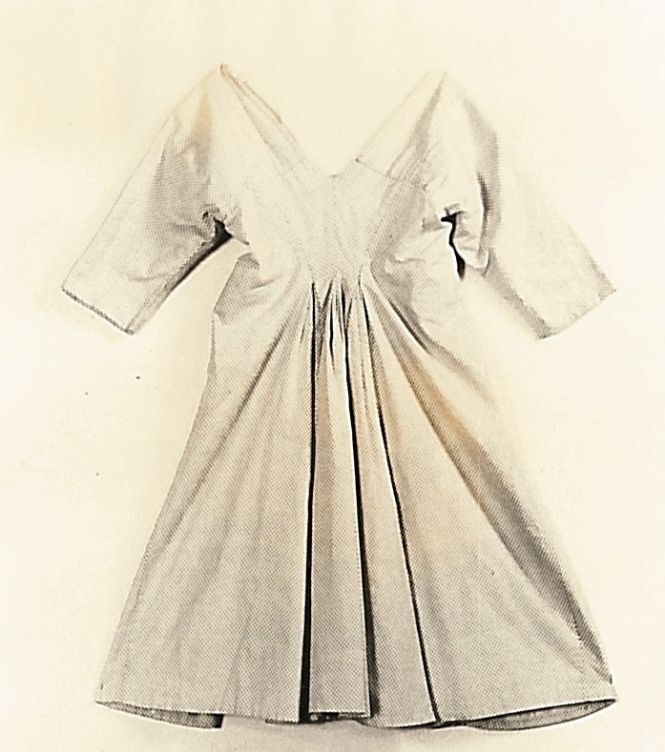 Empire jak met lange schoot en korte mouwen van wit katoen bedrukt met kleine rode driekhoekige strooimotiefjes