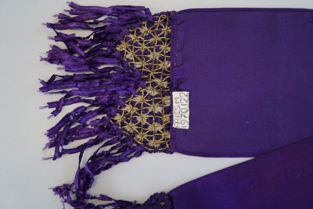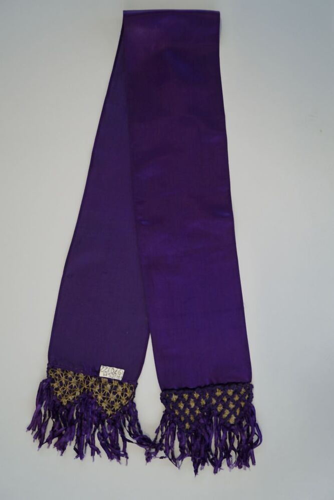 Smal lang sjaaltje van paarse zijden satijn, met franje van chenilledraad en gouddraad