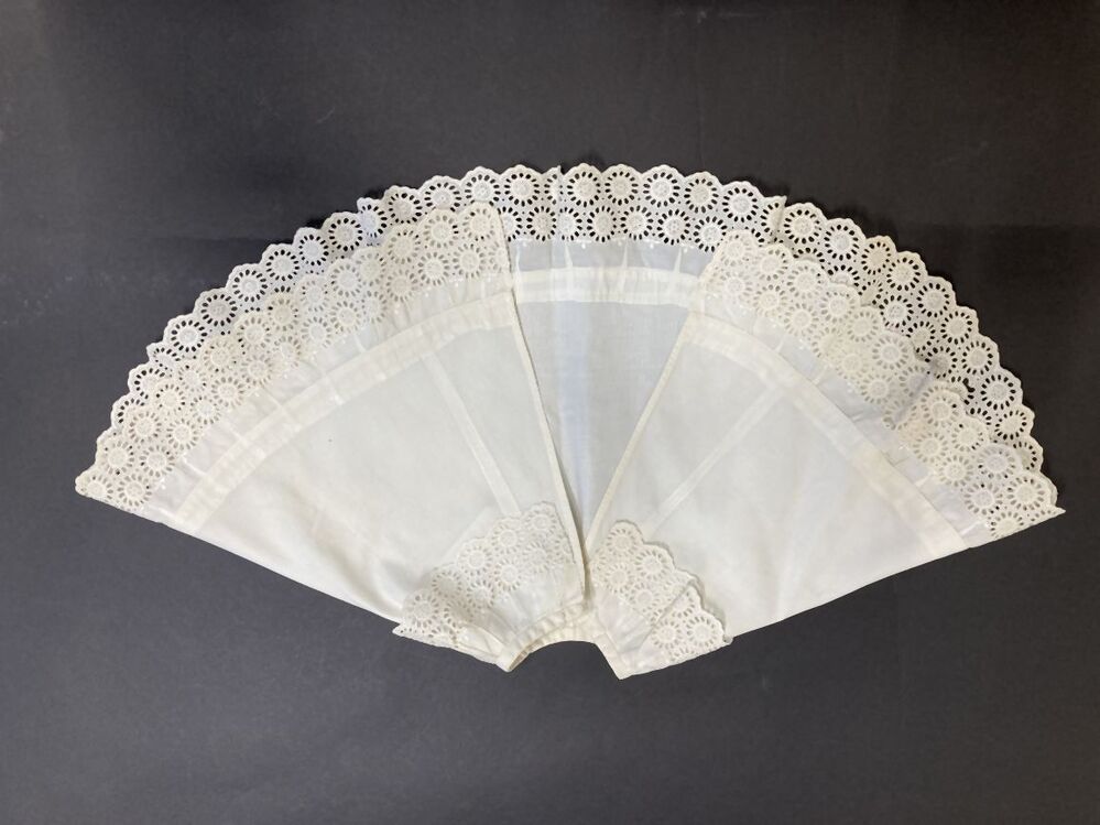 Schoudercape van witte piqué, afgewerkt met rand van Engels borduurwerk