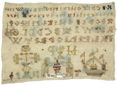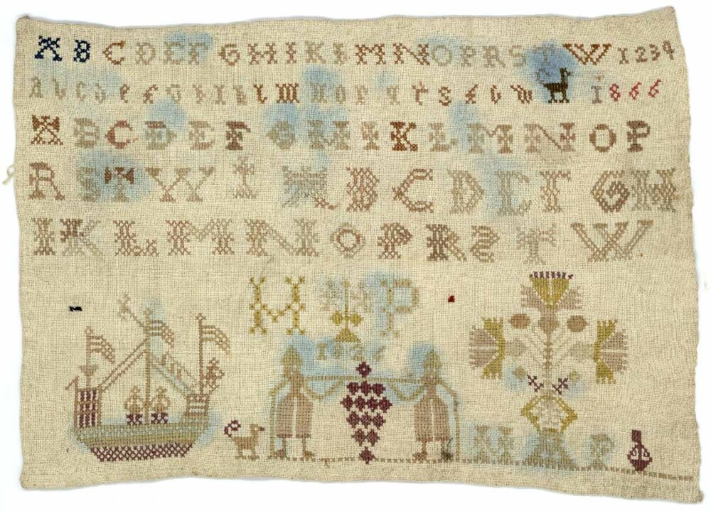 Lettermerklap met uitgelopen blauw, druivendragers, gemerkt H.P. 1826-1866