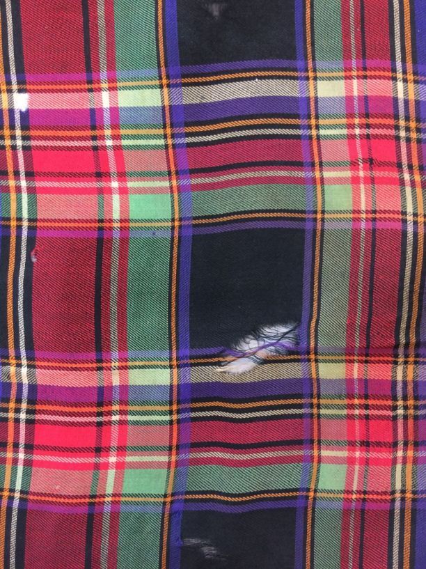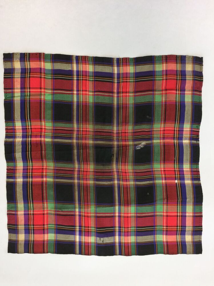 Vierkant geruit sjaaltje in keperbinding in rood, groen, zwart, blauw, beige en oranje