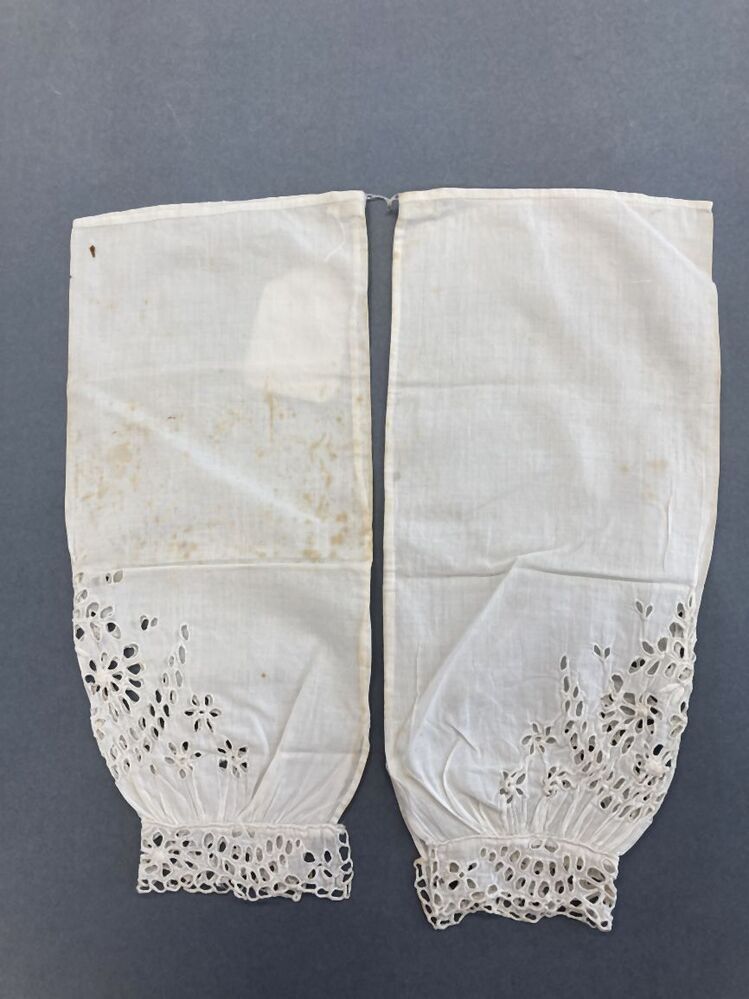 Paar wit katoenen mouwen met engels borduurwerk, gerimpeld aan geschulpte manchetten