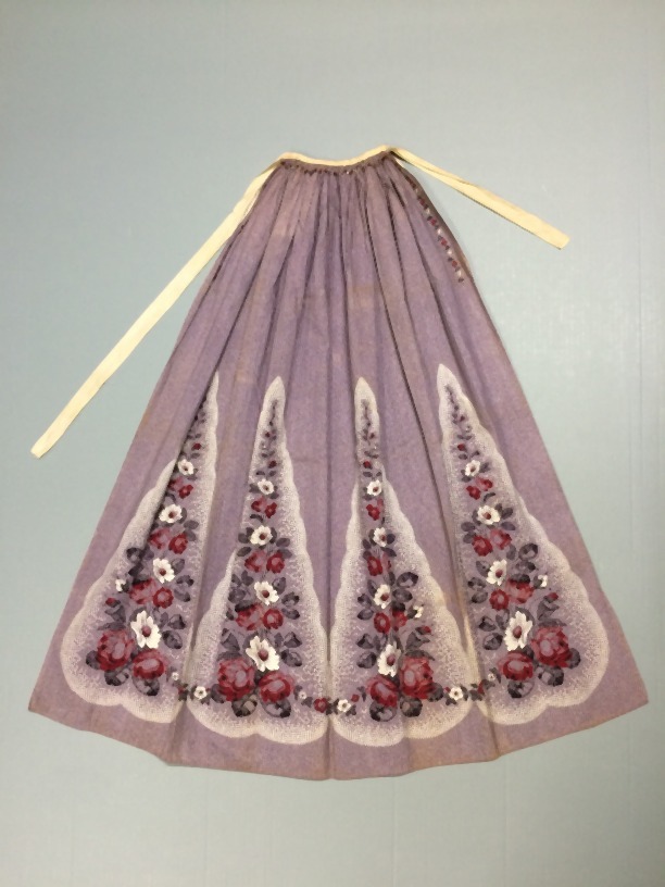 Schort van bedrukt katoen, paars fond met rood-wit-blauw bloemmotief en met zijden lint