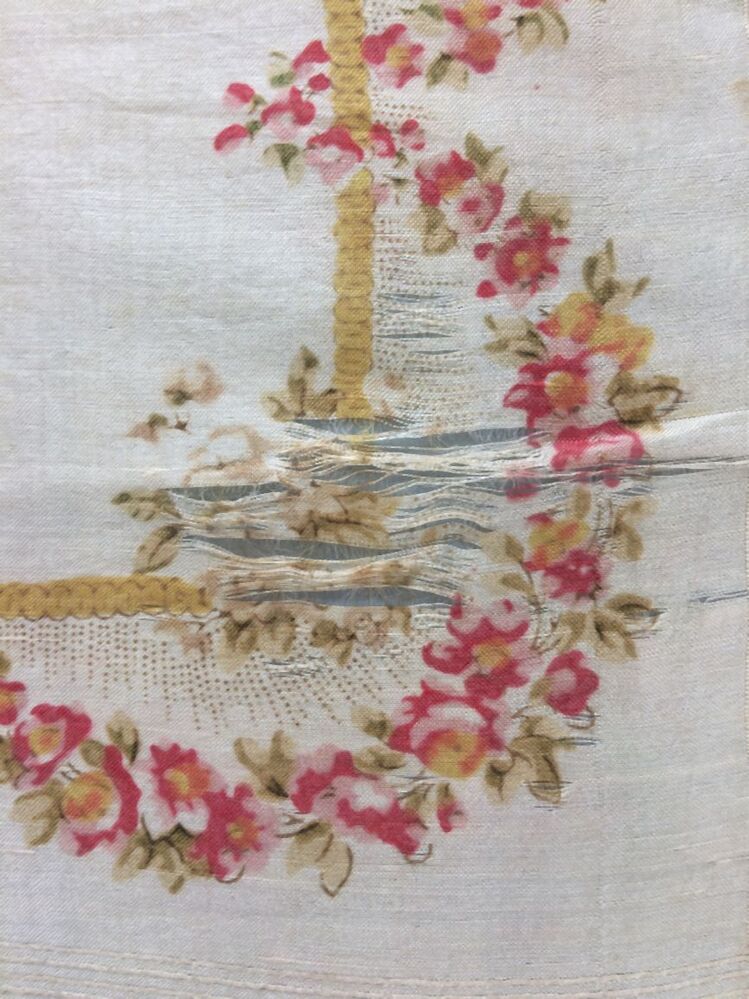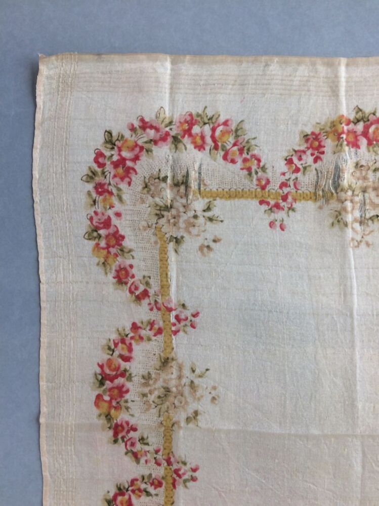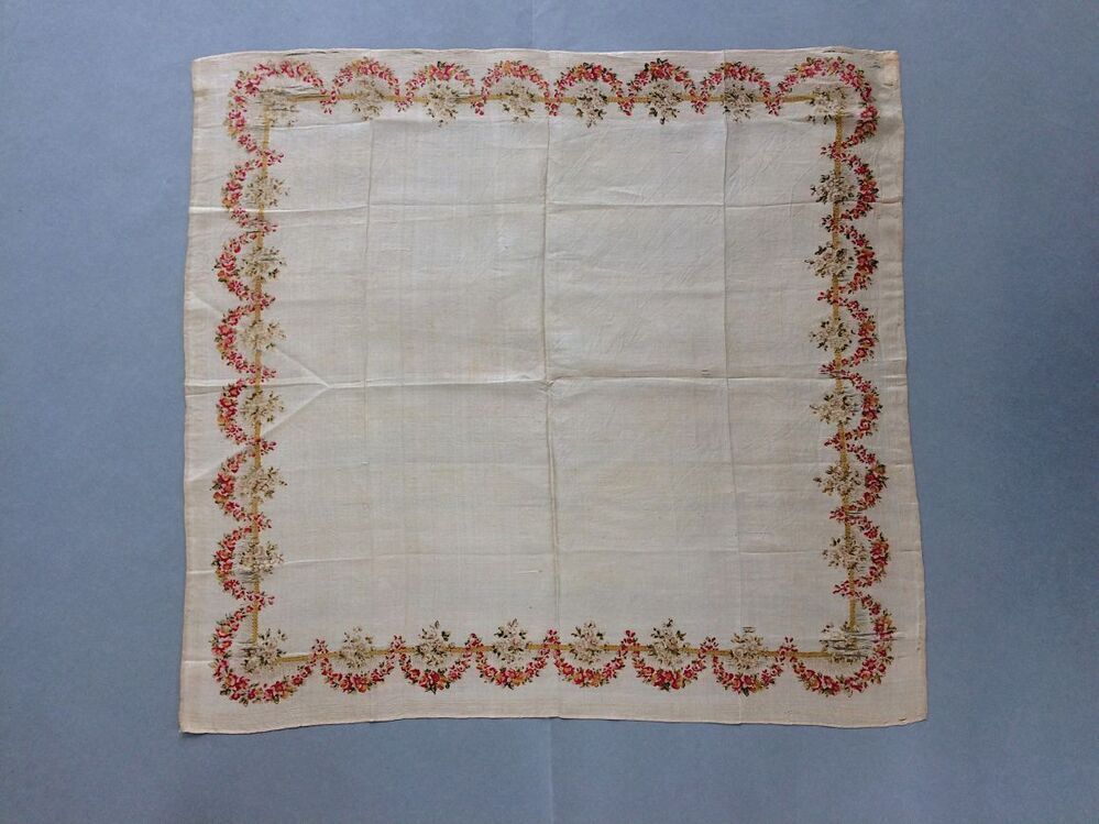 Sjaal van creme zijde waarop een rand gedrukt is bestaande uit festoenvormen van rode en gele bloemetjes en blaadjes opgevuld met witte bloemige boeketjes