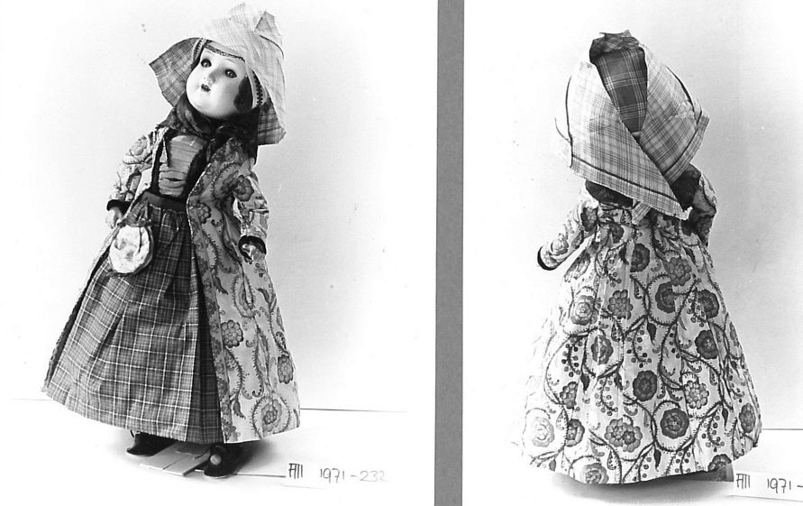 Pop in sitsen poppewentke met motieven op witte grond, contouren zwart, met bijbehorende stolp (B)