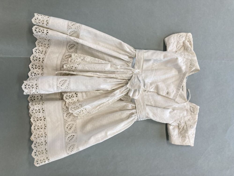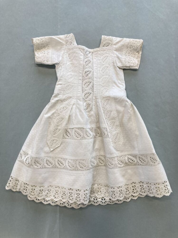 Kinderjurkje van wit katoen met klein damast patroontje met broderie