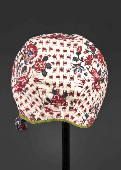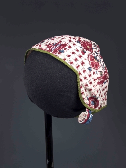 Sitsen meisjesmuts, beschilderd met grondjes met bloemetjes op op witte grond met rode kammetjes