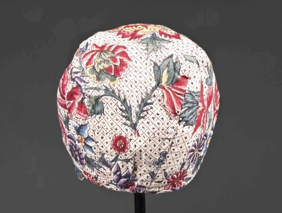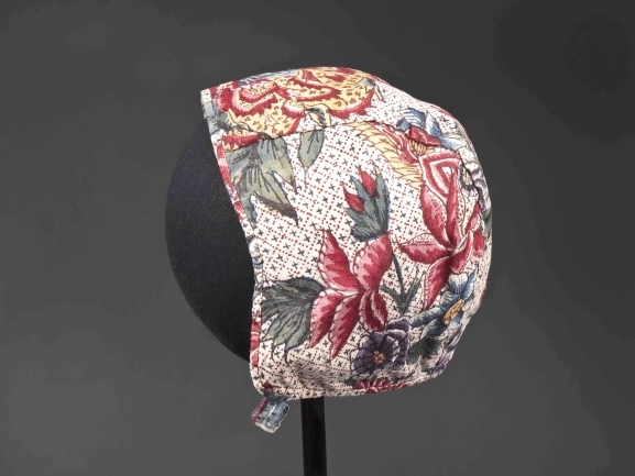 Sitsen meisjesmuts, rastergrond waarover naturalistisch bloempatroon op witte grond