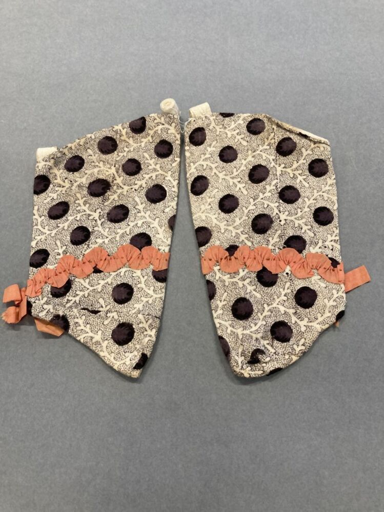 Paar driekwart mouwtjes van bedrukt katoen, paars gespikkeld fond met uitgespaarde ranken en paarse stippen