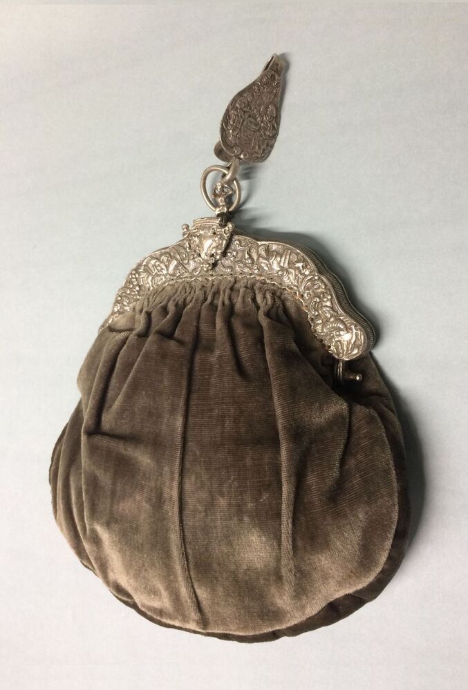 Grijs fluwelen tas aan zilveren beugel waaraan met ring een zilveren haak is bevestigd.