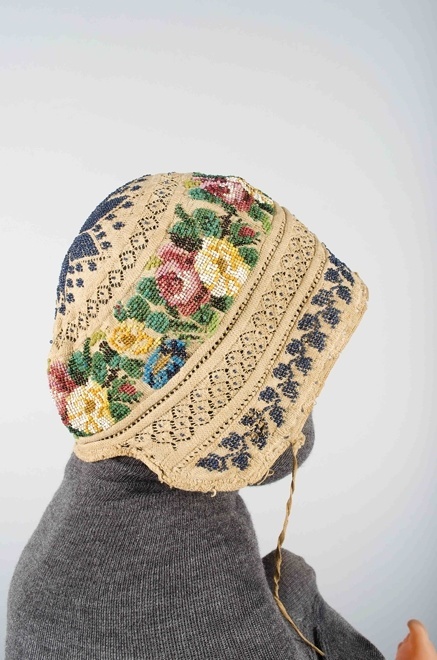 Gebreid mutsje van wit katoen met ster en bloemmotieven van veelkleurige kralen
