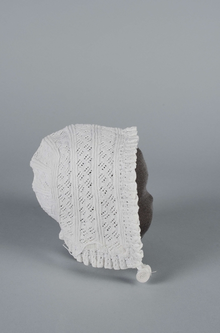 Mutsje van witte katoen, ajour gebreid met zig-zag blokjes