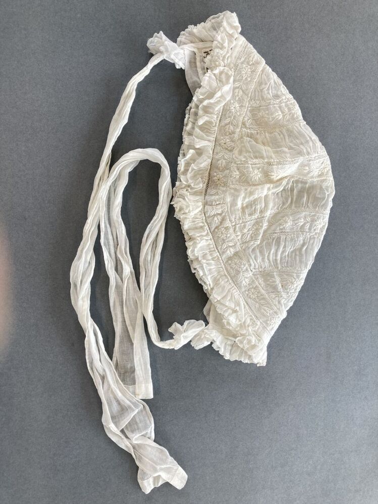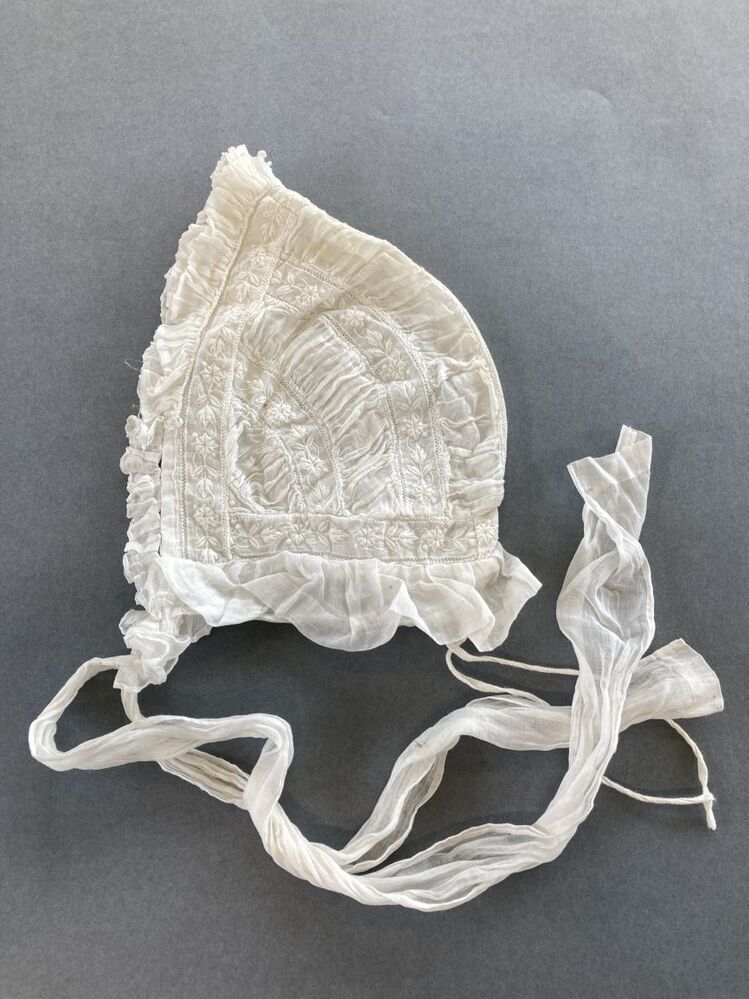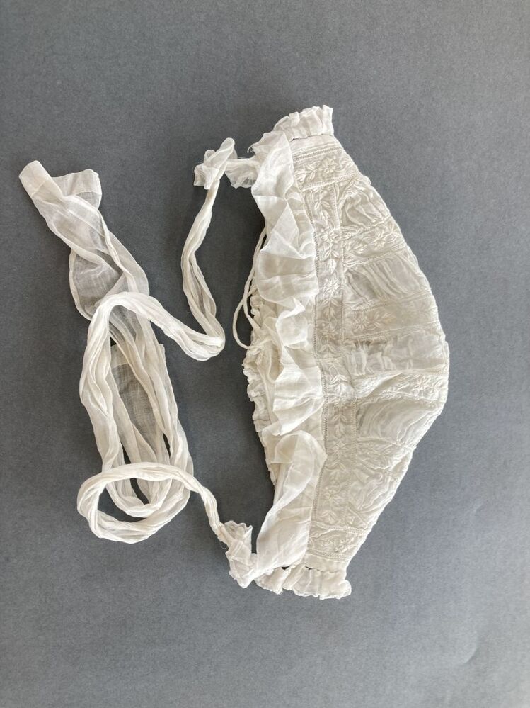 Kindermuts van gerimpeld neteldoek en geborduurd batist met bloemetjes, met twee lange banden om te strikken