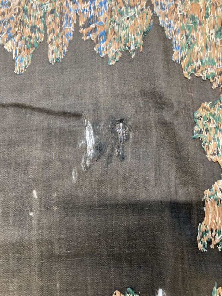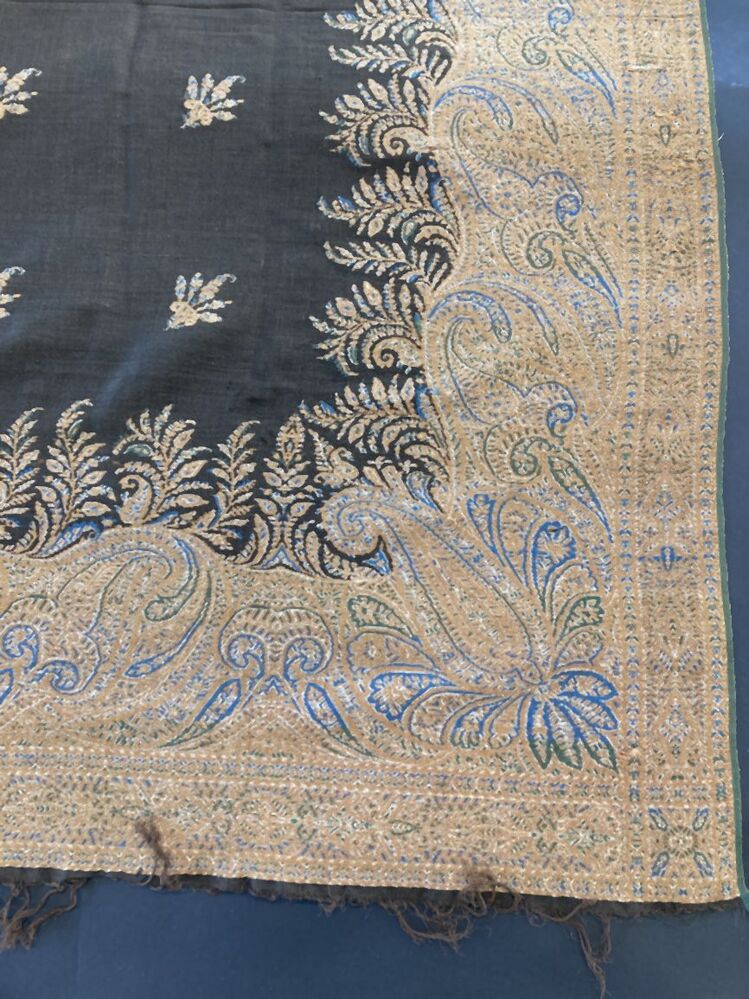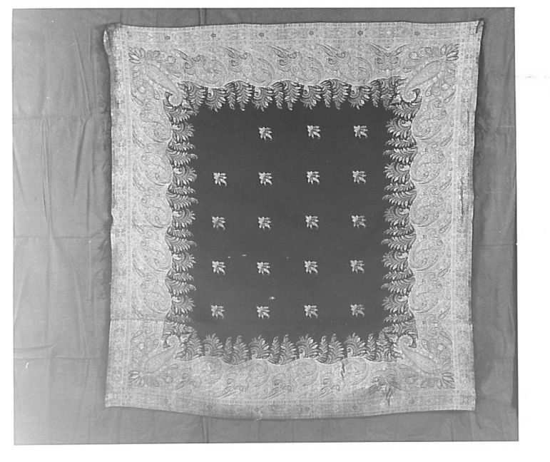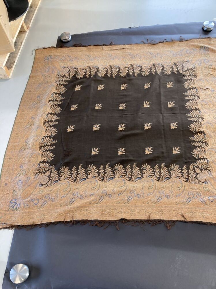 Omslagdoek van gekleurde wol met donkerbruin fond met strooimotieven